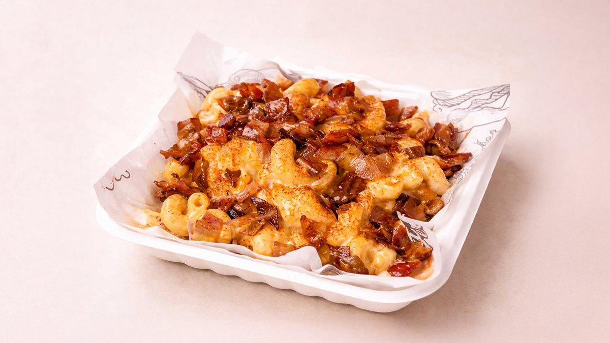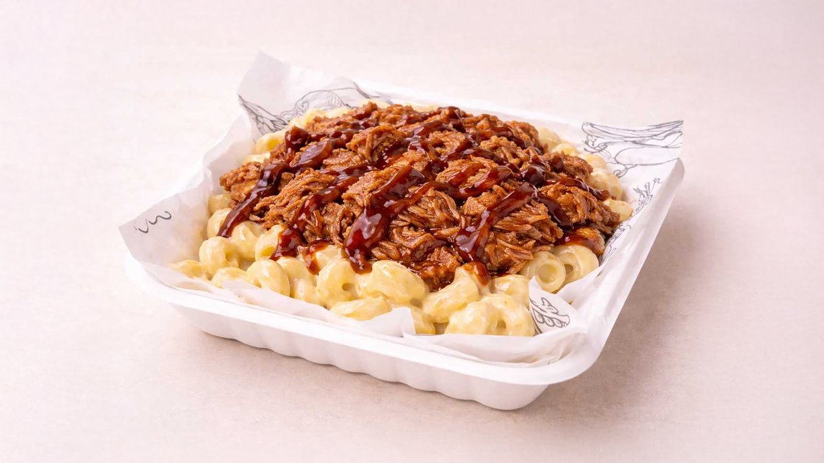 Indulge in hearty mac & cheese mixed with tender, slow-cooked pulled pork for a satisfying savoury experience.