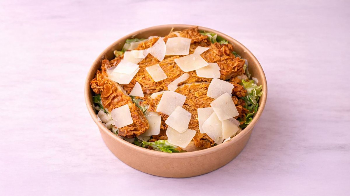 Dive into a classic Caesar salad reimagined with crunchy romaine lettuce, topped with golden crispy chicken, rustic croutons, bacon bits, shaved Parmesan & drizzled with our creamy Caesar dressing. Perfect for those who love a little crunch with their greens.