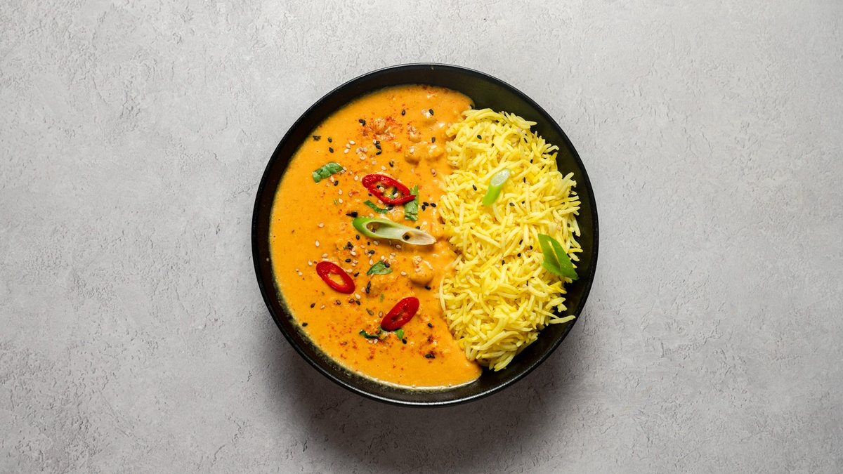 Spiced roasted sweet potatoes, and grilled chicken in a creamy coconut curry sauce served with aromatic rice Calories: 484 kcal Protein: 34 g *contains dairy, sesame, and soy*