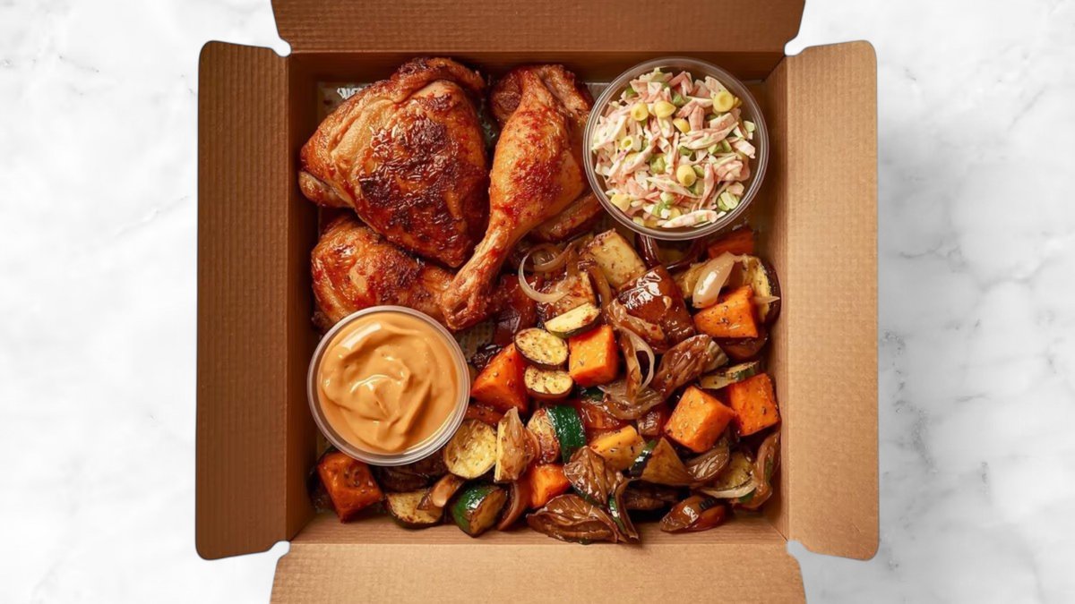 High protein activated charcoal pizza base, classic tomato, fresh water mozzarella, sliced chicken legs, zero calorie barbecue sauce, corn, oregano and mushrooms Calories: 750 Protein: 72g