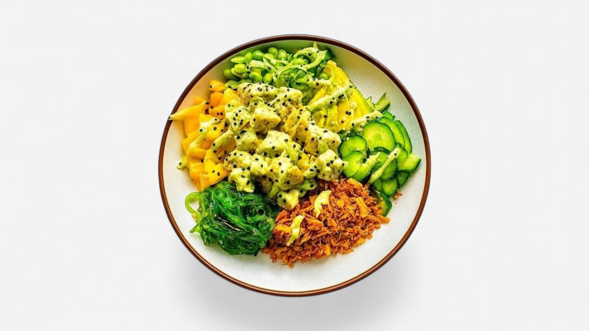 Teriyaki chicken, sushi rice, avocado, cucumber, edamame, mango, spring onion, sesame, crispy onions, wakame, and yuzu sauce. Calories: 665 kcal Protein: 42.2 g *contains sesame and soy*