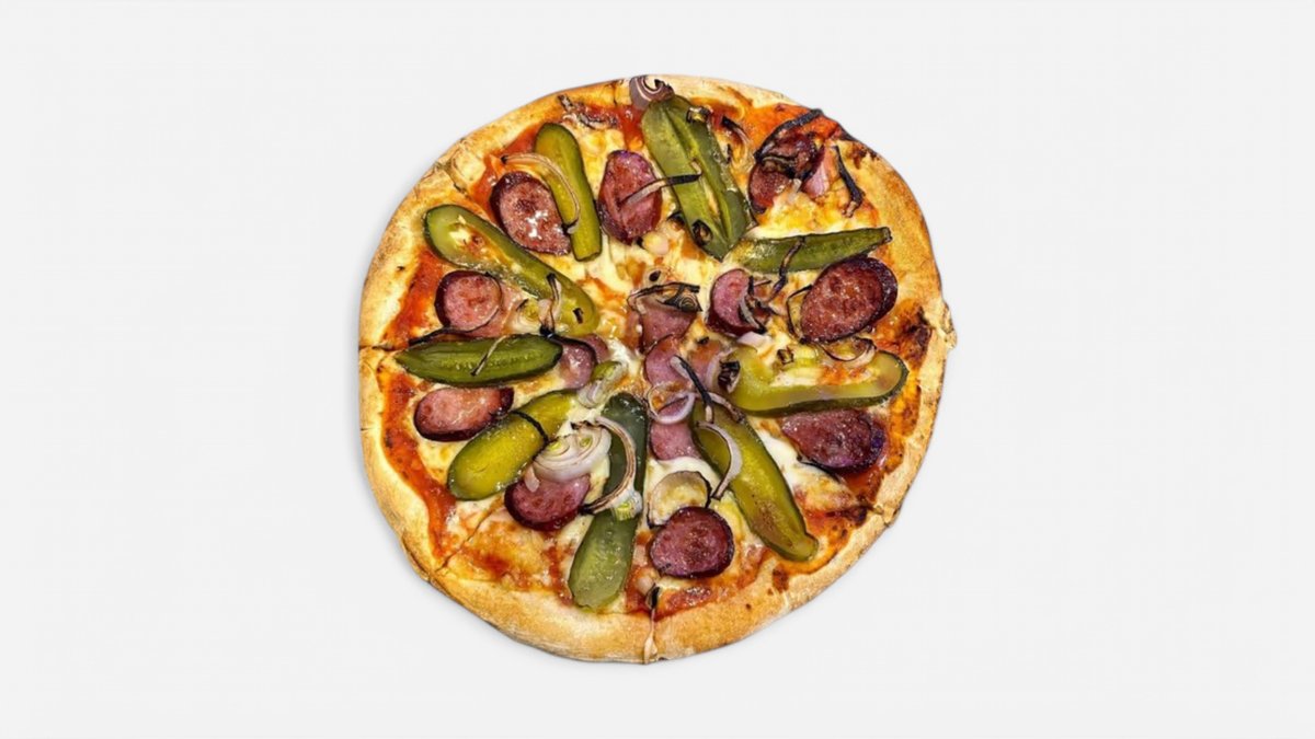 With Polish sausage, onion, mozzarella cheese, dill pickled cucumbers, tomato salsa