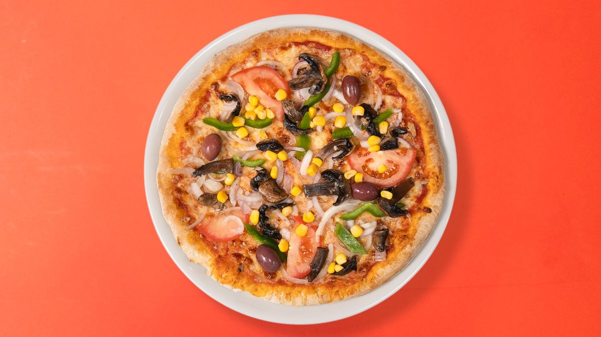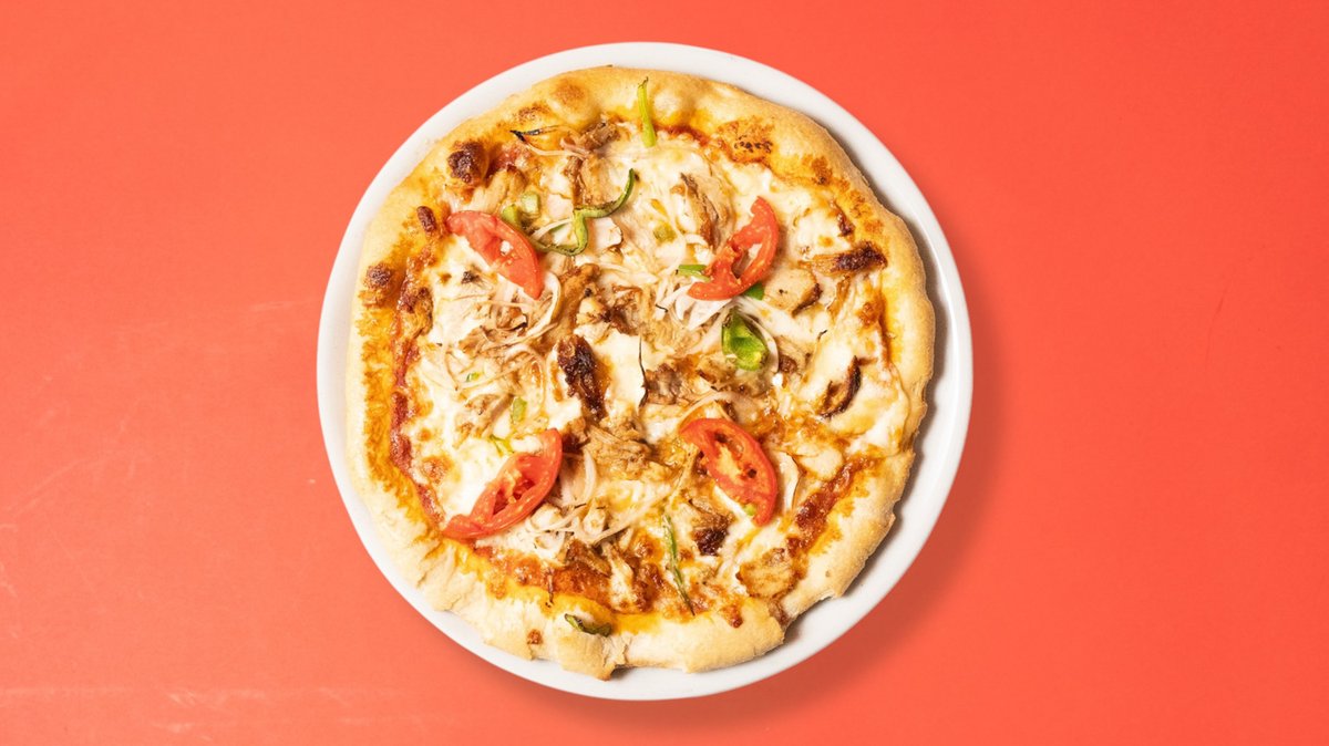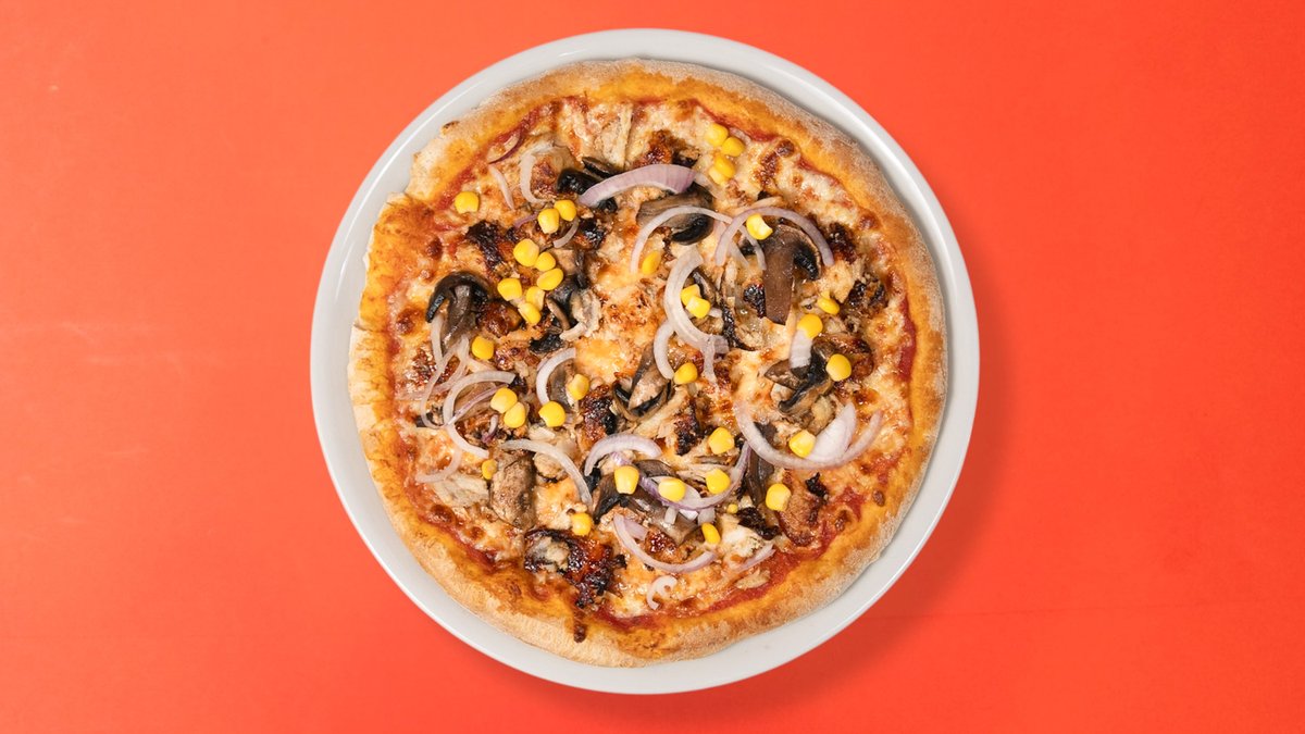 Tomato sauce, mozzarella, mushrooms, chicken, onions and sweet corn