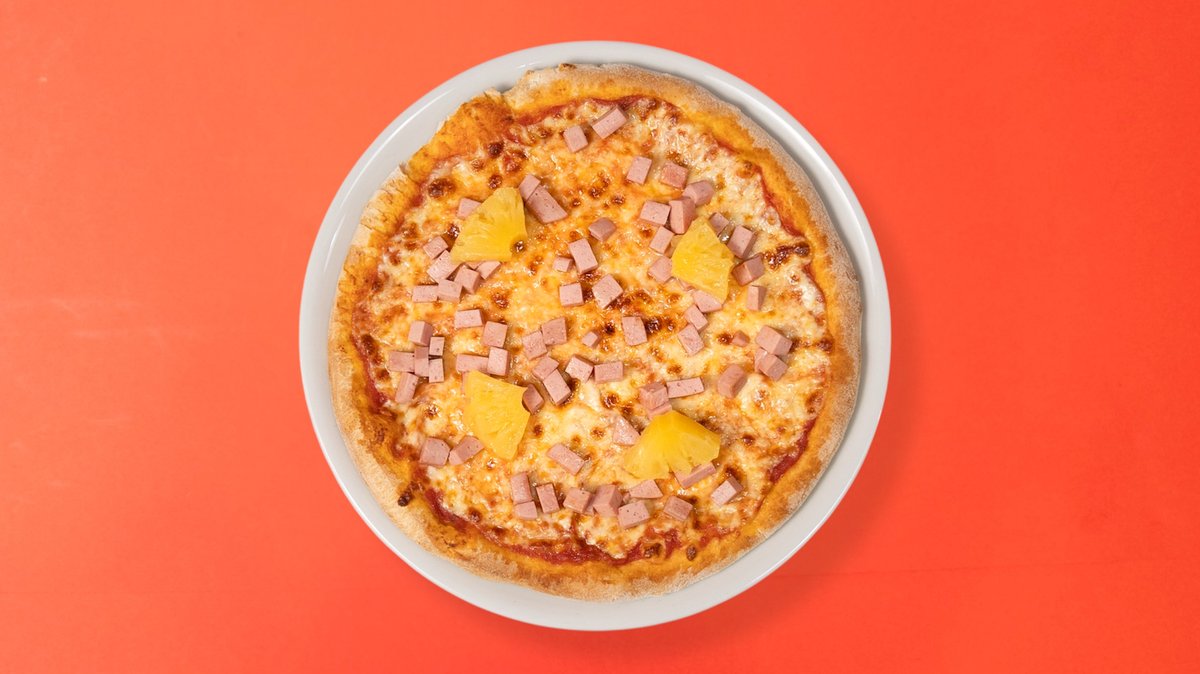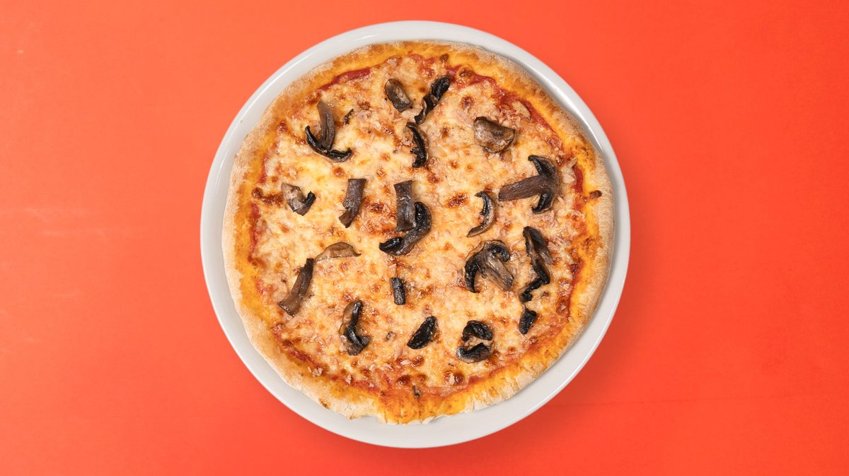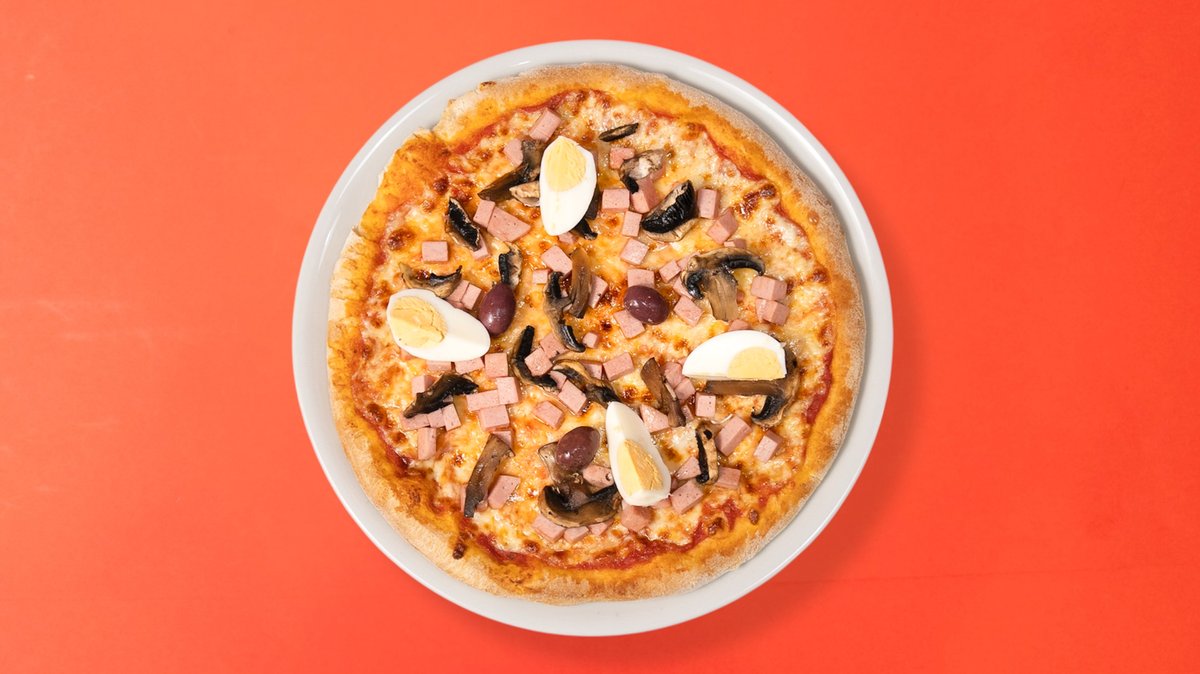 Tomato sauce, mozzarella, mushrooms, egg, black olives and ham