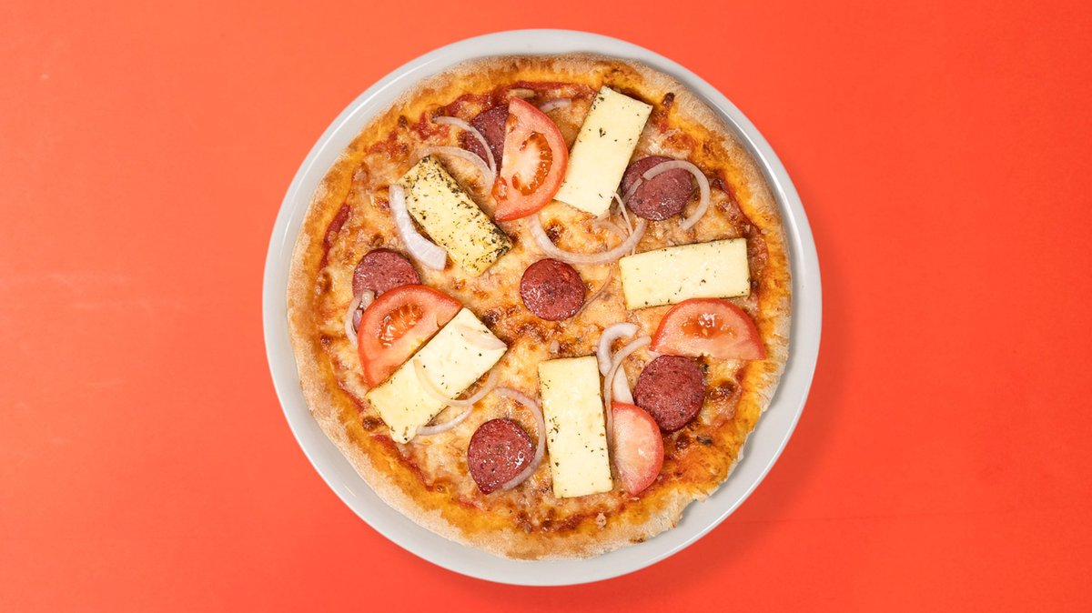 Savor Habibi's Special Pizza, a tasteful blend of halloumi, mozzarella, pepperoni, onions, tomatoes, and tangy tomato sauce
