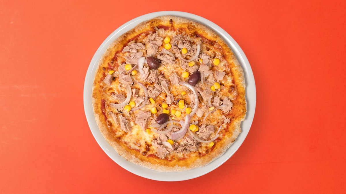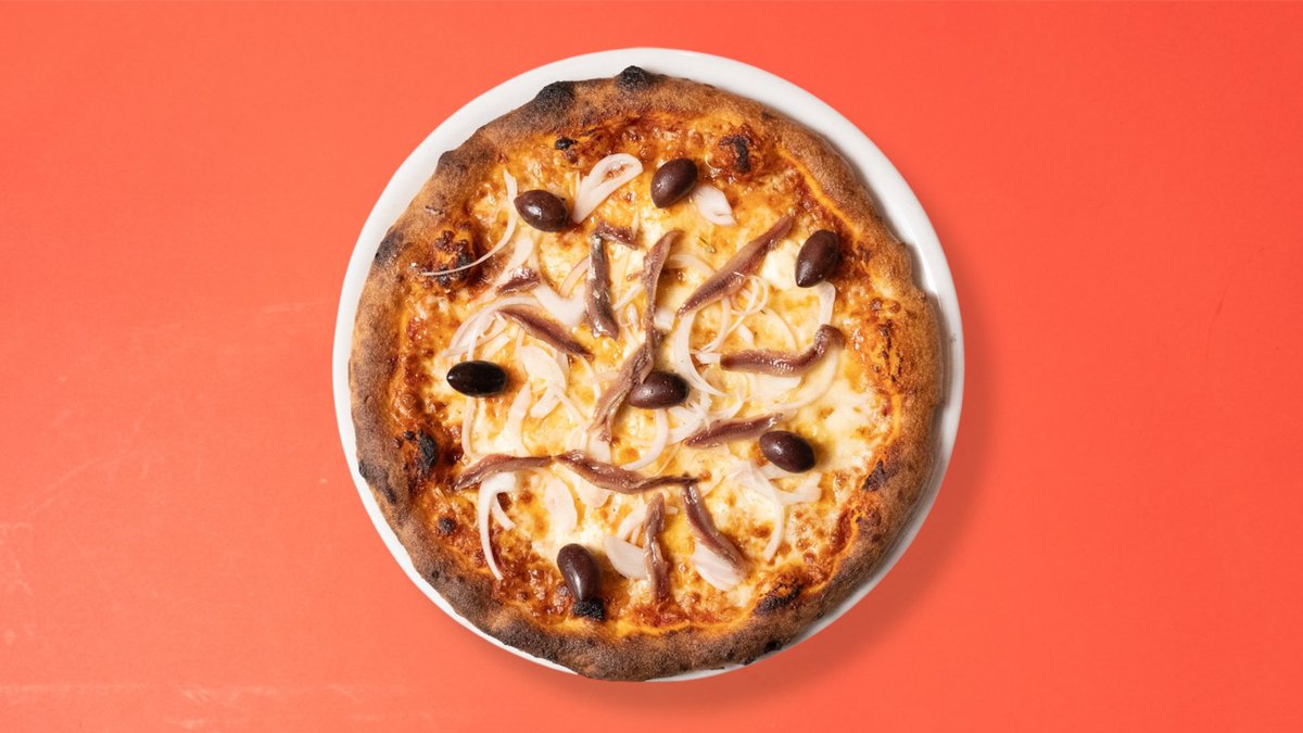 Tomato sauce, mozzarella, anchovy, onions and black olives