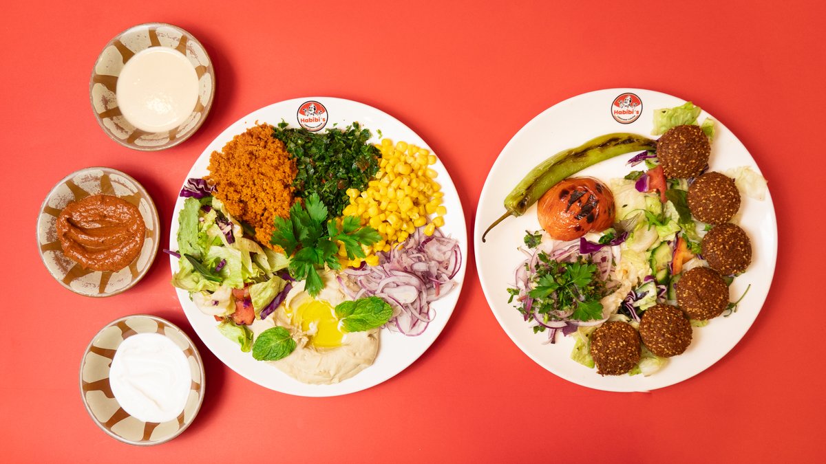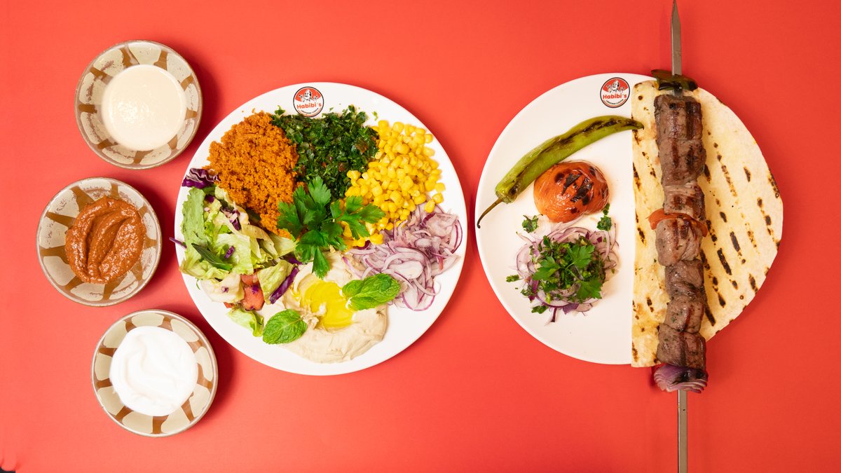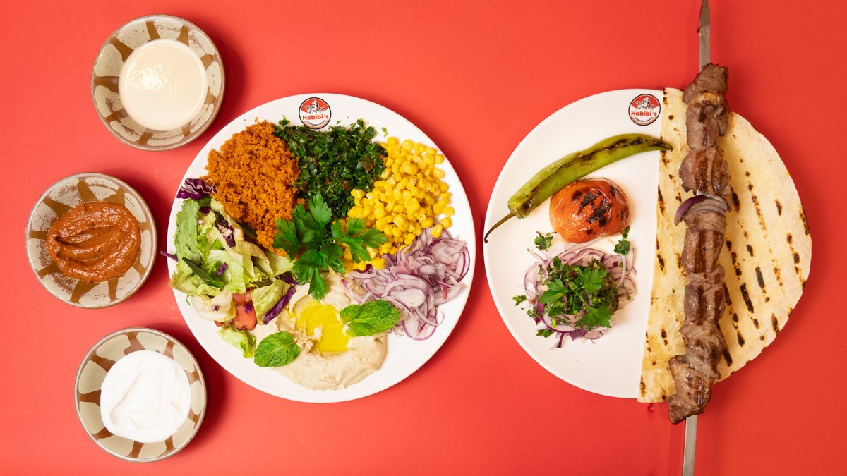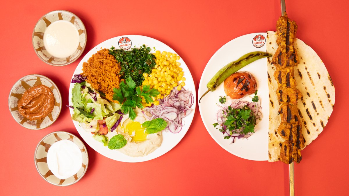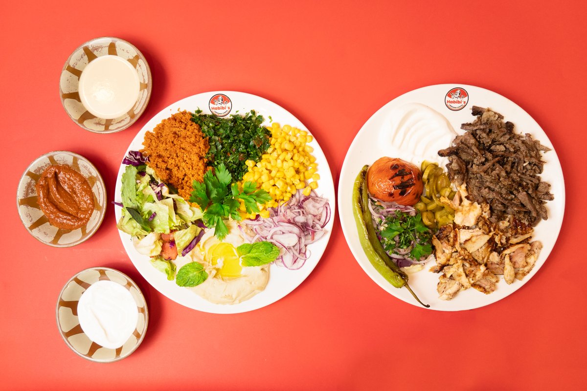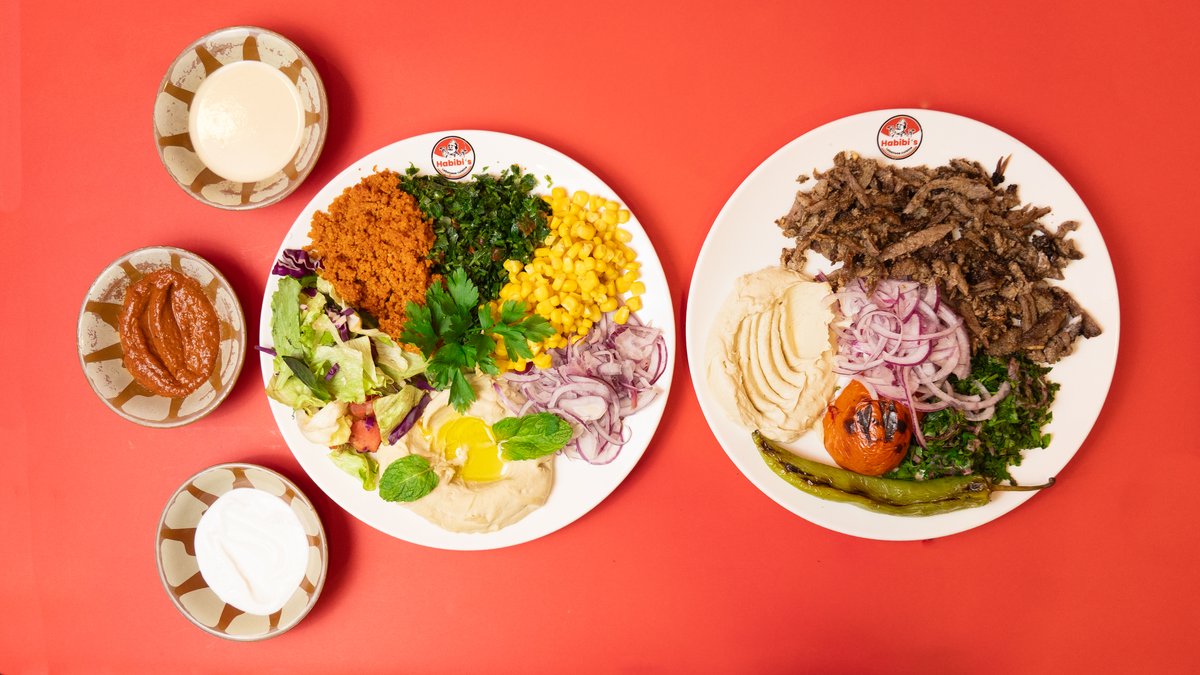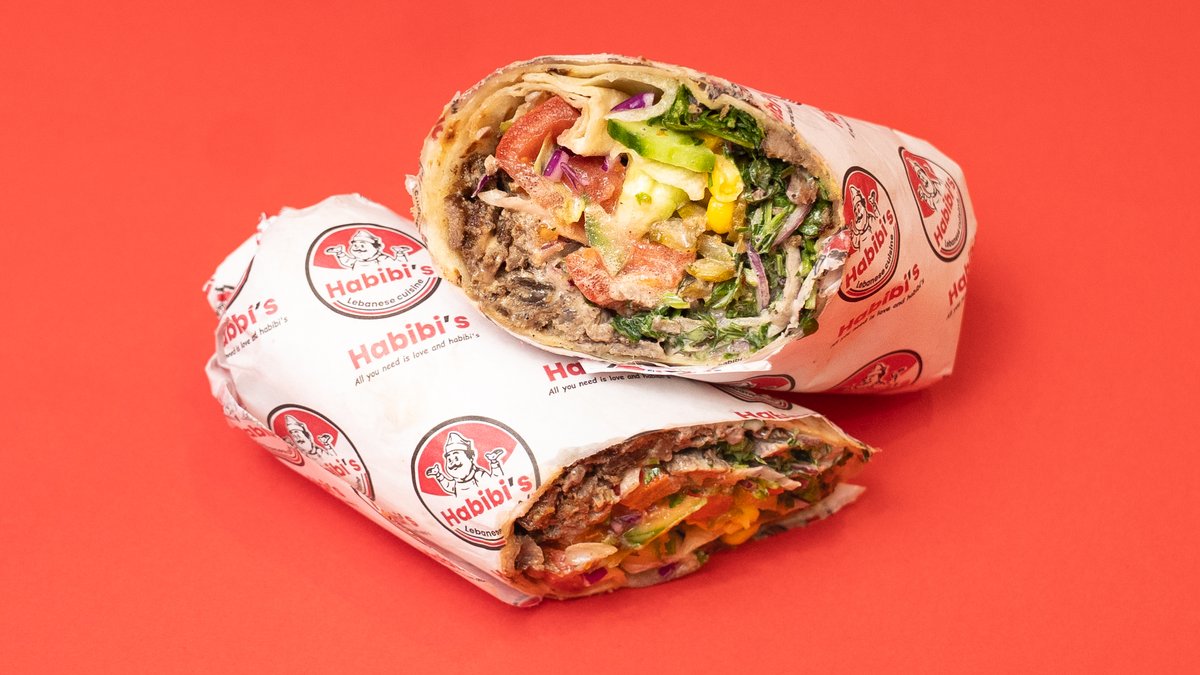 Indulge in Habibi's Mixed Shawarma Wrap, a flavorful blend of succulent chicken and beef, wrapped in warm bread