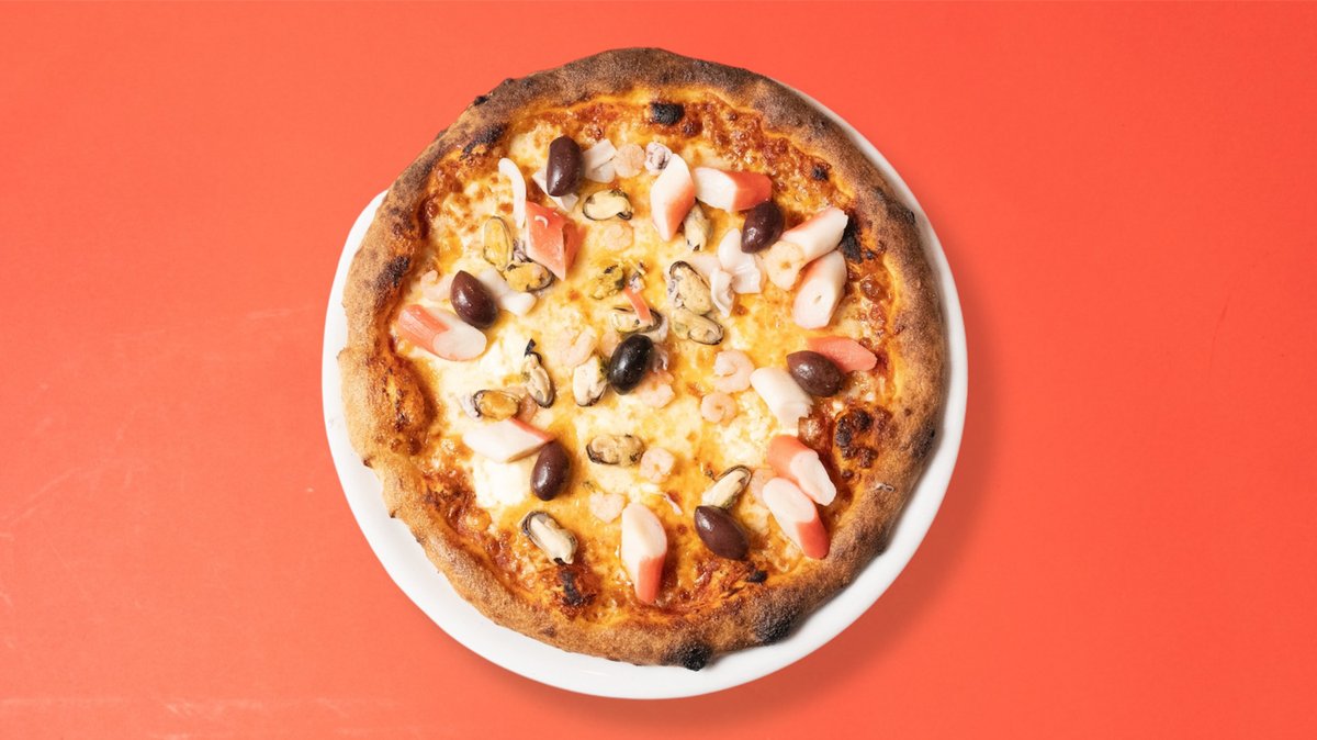 Tomato sauce, mozzarella, mixed seafood and black olives