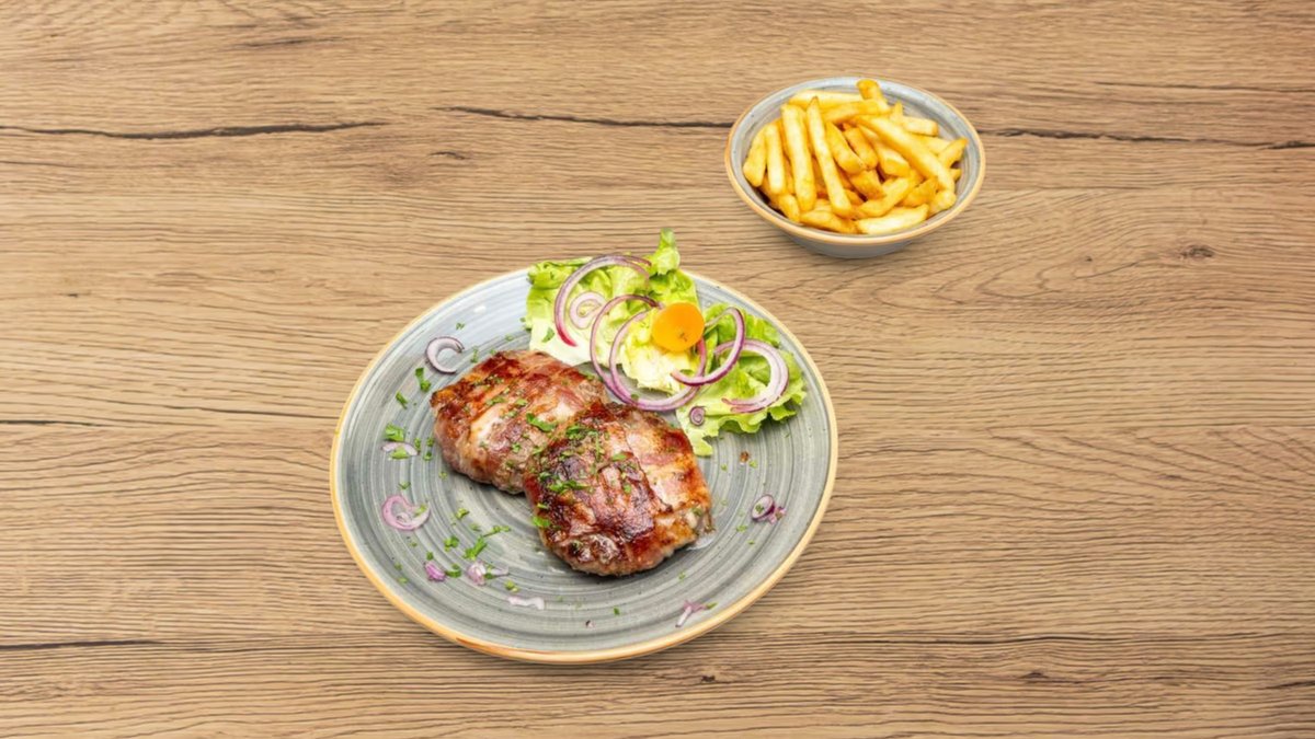 Grilled Angus beef and pork patty, served with FRISE