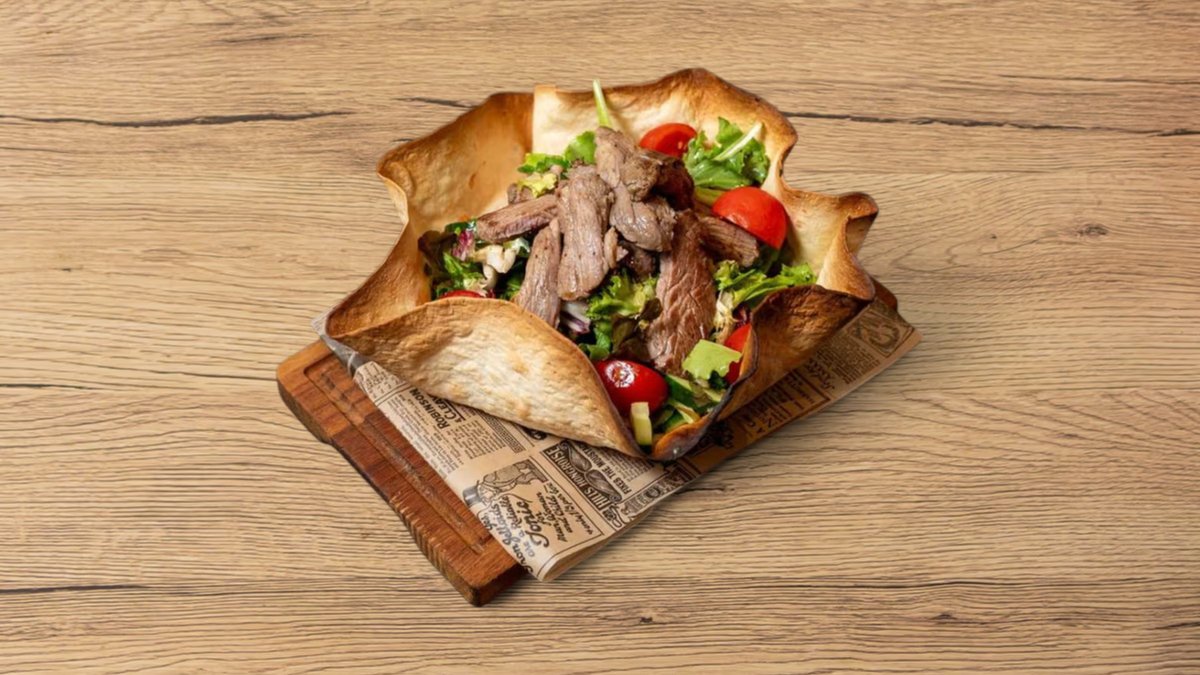 Drizzled mix salad with in-house honey-mustard sauce with baby spinach, grilled black Angus beef stripes, cherry tomatoes, and bell peppers finished with sesame seeds, served in a tortilla basket.