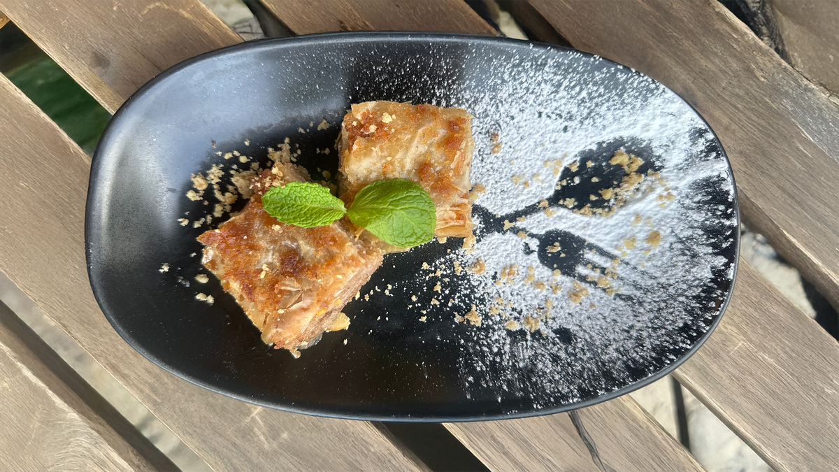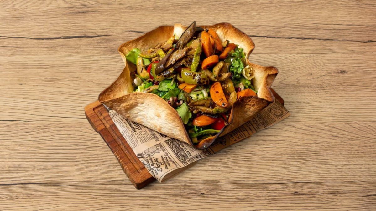 Drizzled mixed salad with in-house orange dressing. fresh cucumber & onion, grilled zucchini, aubergine, bell pepper, and carrot, served in a tortilla basket.