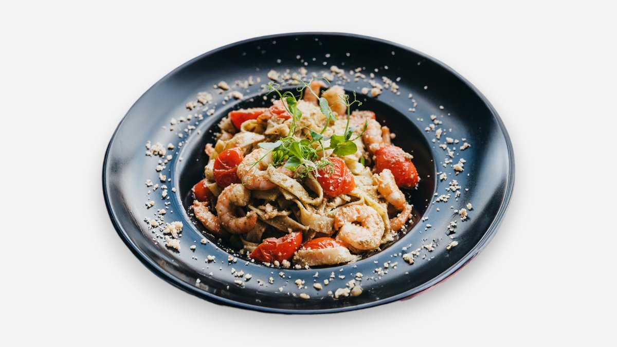 Pistachio and walnuts pesto, baby prawns, cherry tomato, garlic.