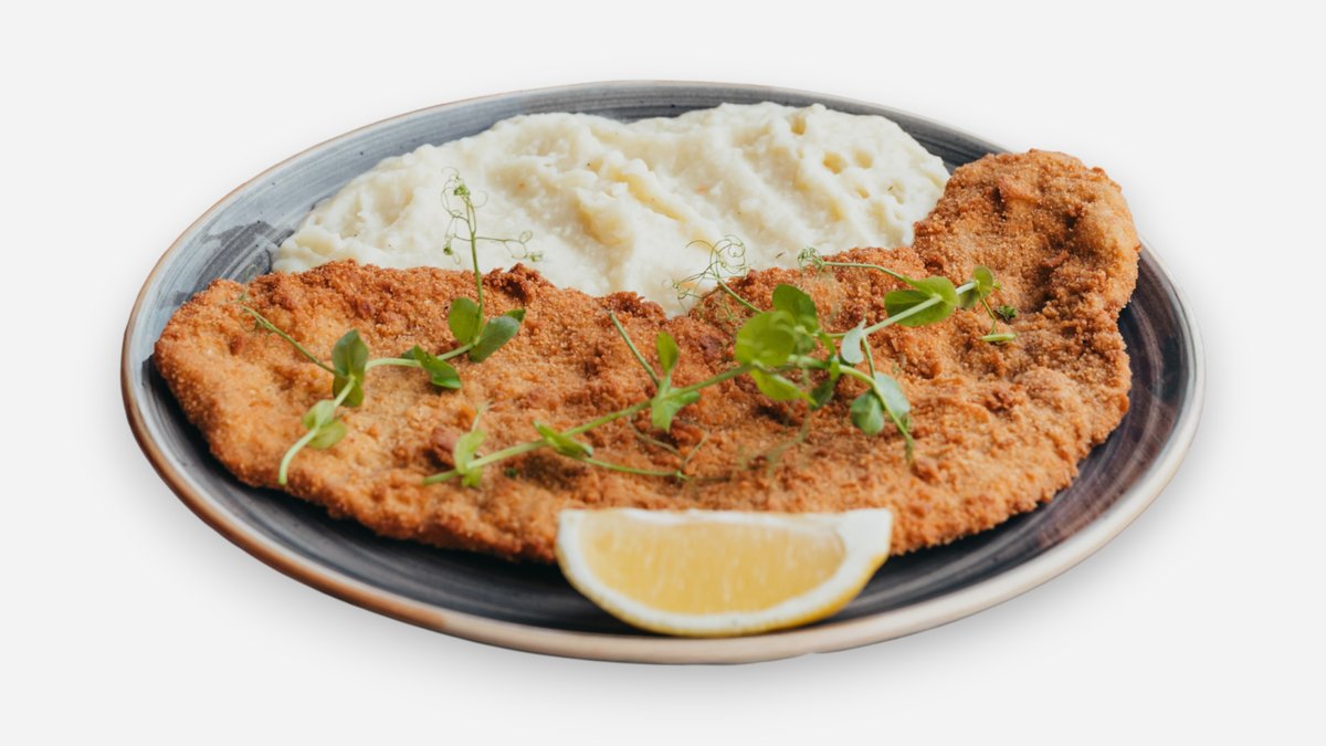 Breaded thin slices of veal, served with mashed potatoes and lemon wedge