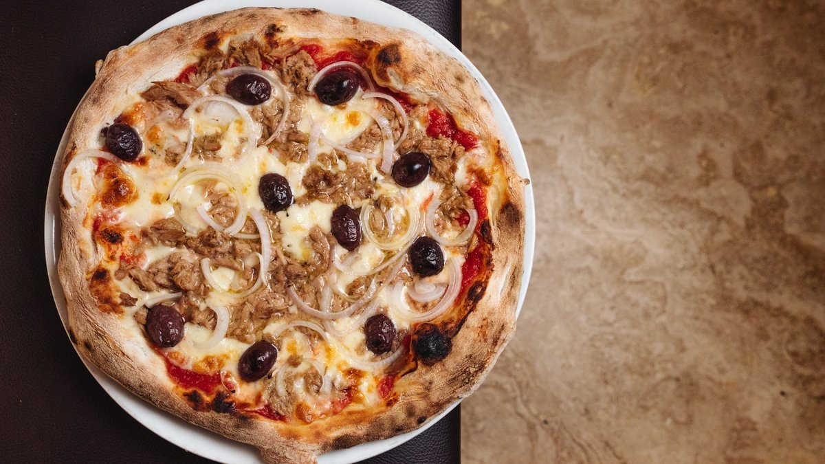 Pomodoro san marzano, mozzarella fior di latte, tonno, cipolle, olive and olio extra vergine