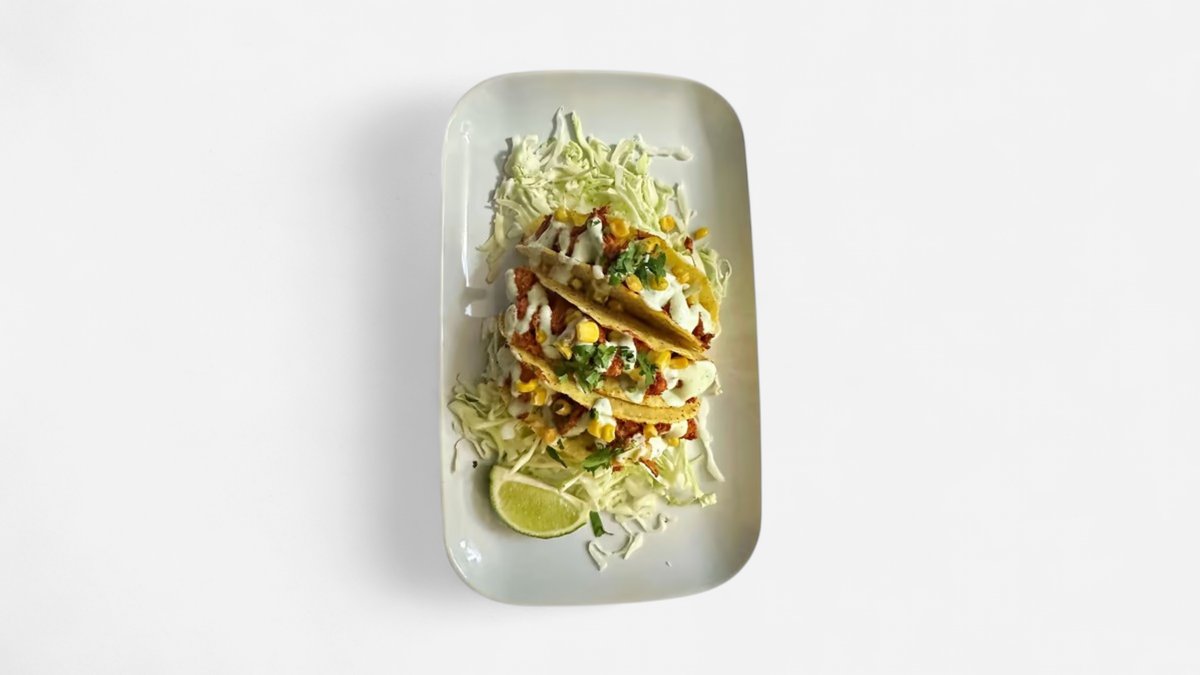 Cheese, tender chicken, cabbage slaw, roasted corn and cilantro cream. Garnished with red onions and coriander
