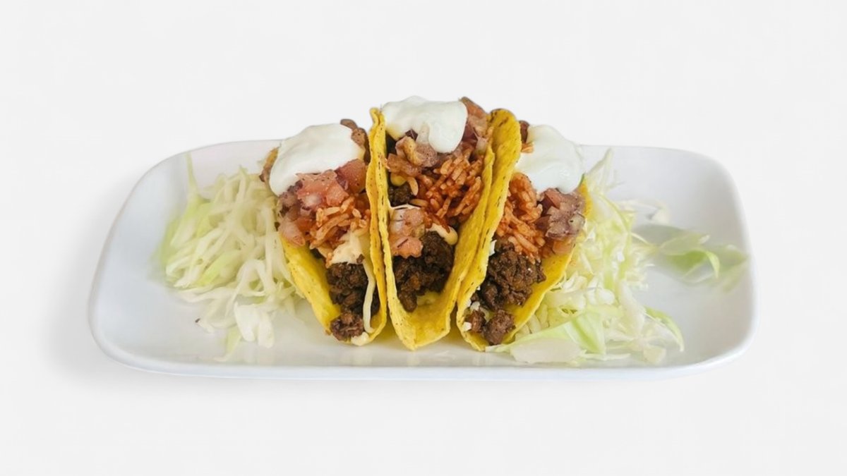 A corn tortilla fried into a U shape, then stuffed with cheese, meat and vegetables.