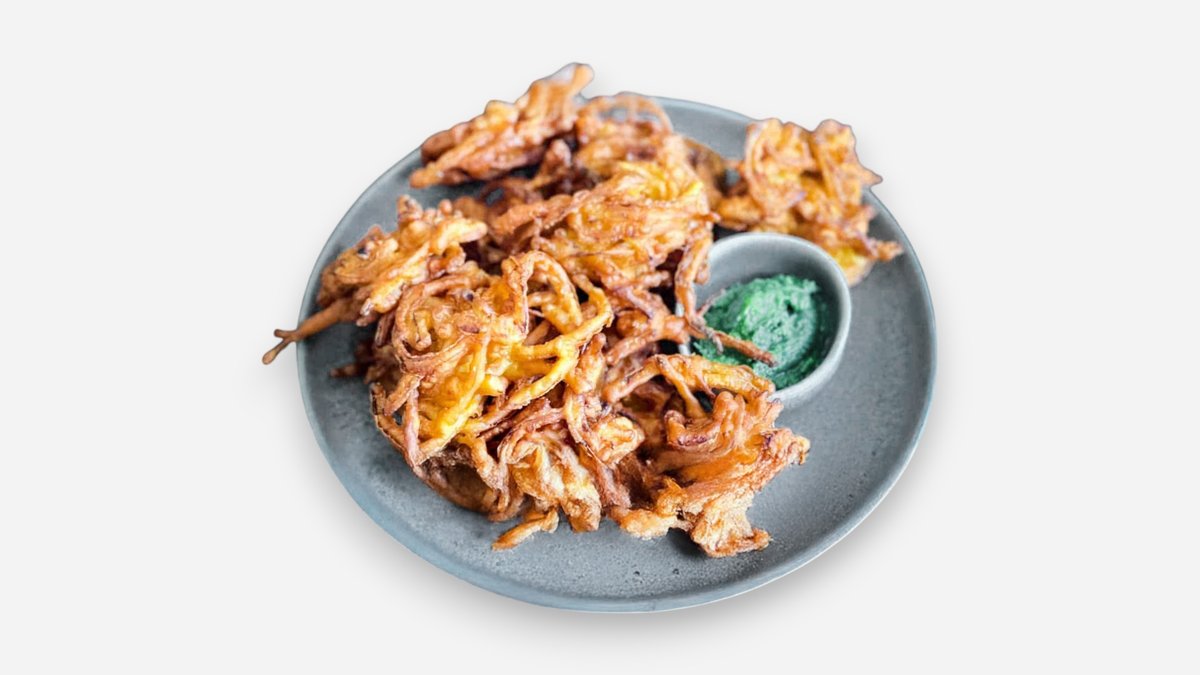 Thinly sliced onions are mixed and coated in a chickpea flour batter then dropped into a frying pan of hot oil and cooked until crisp