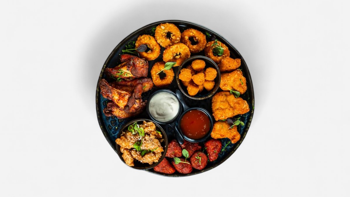 Crispy Fried Chicken Platter, A selection of Chicken Wings, Spicy Cheese Fritters, Asian Fried Chicken ,Chicken Rings, Chicken Chunks, Crispy Goujons Bites Served with Sweet n Sour Sauce and Home made Mayo Sauce.