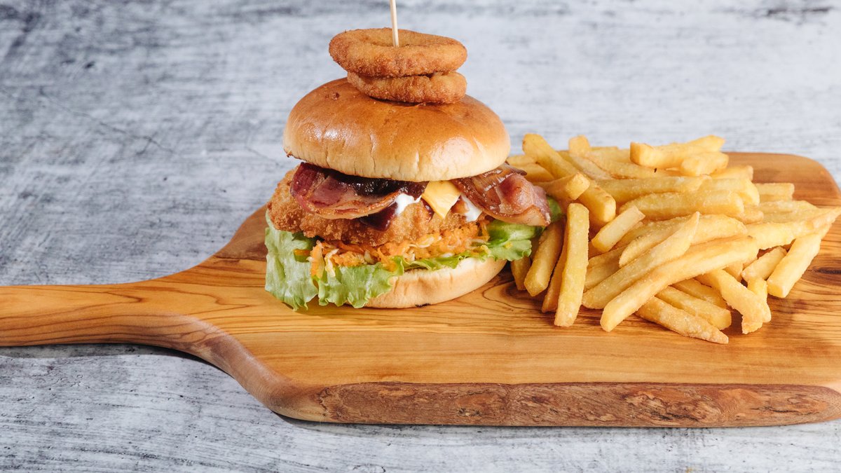 Brioche bun, crispy chicken fillet, bacon, cheese, mayo, BBQ sauce, in-house coleslaw, caramelized onions and lettuce. Served with a side of crunchy chips and onion rings