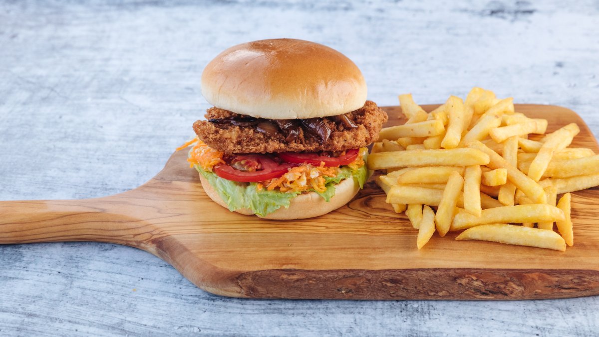 Brioche bun, crispy chicken fillet, lettuce, tomatoes, in-house coleslaw and caramelized onions. Served with a side of crunchy chips