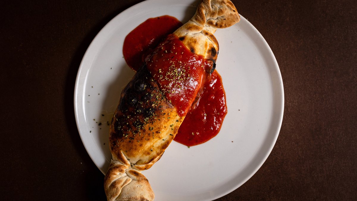 Mozzarella, Ham, Boiled Eggs, Mushrooms, and Drizzle of Tomato Sauce.