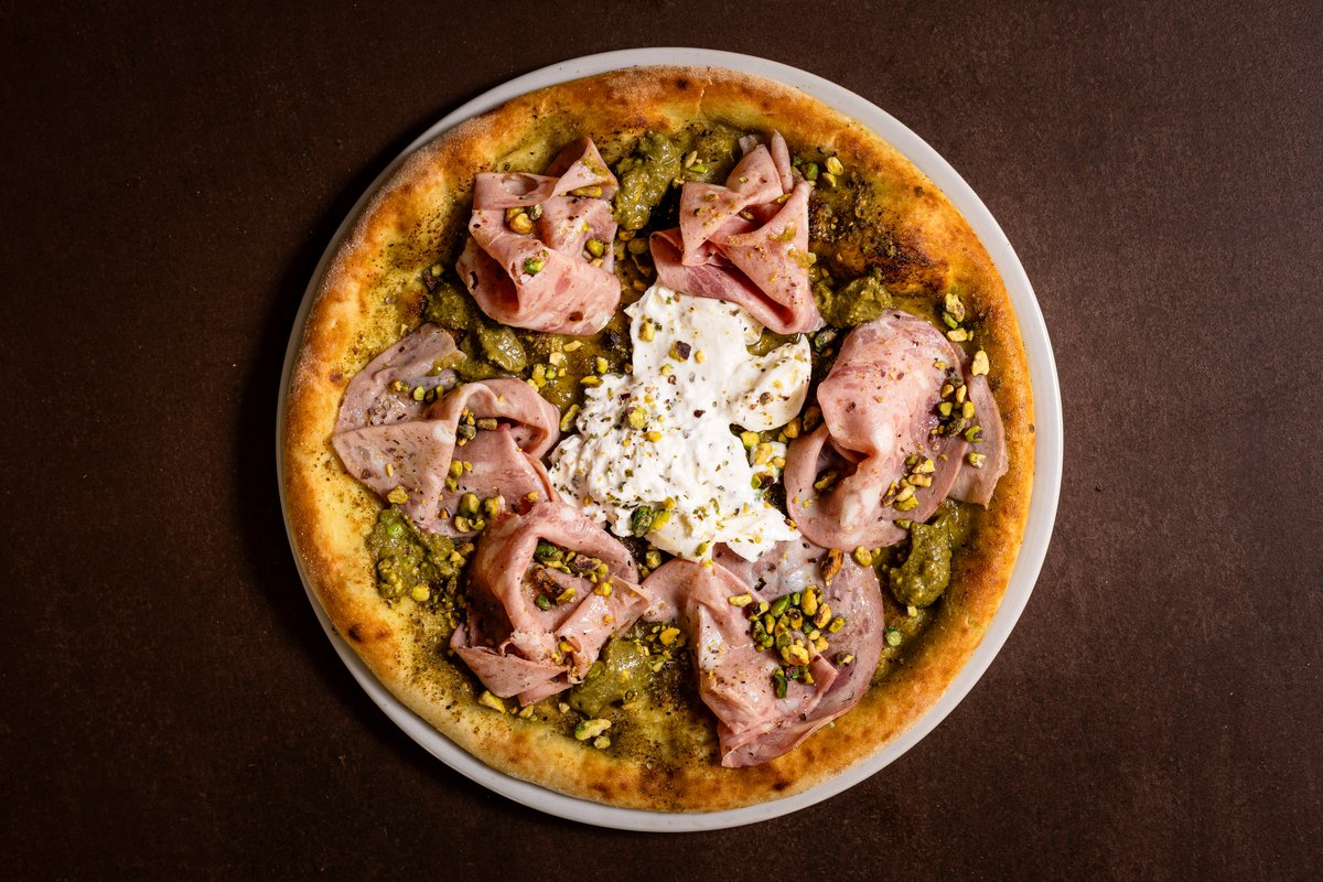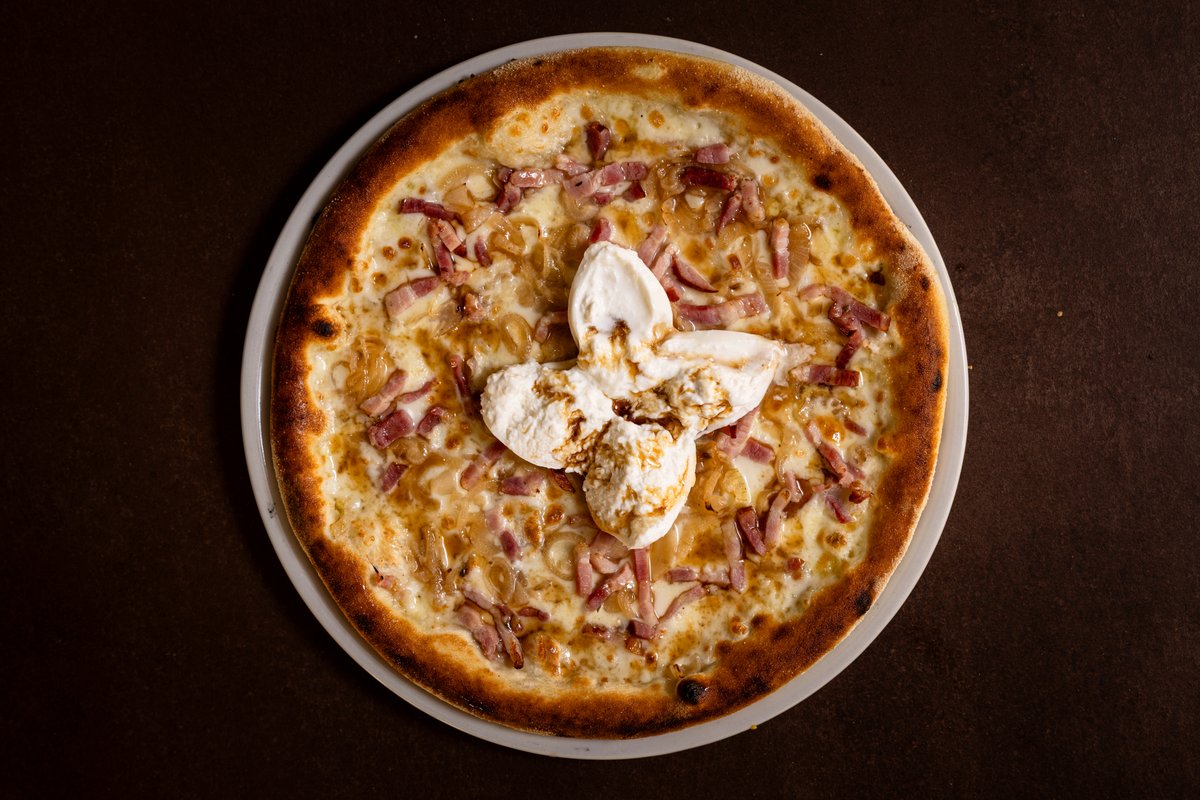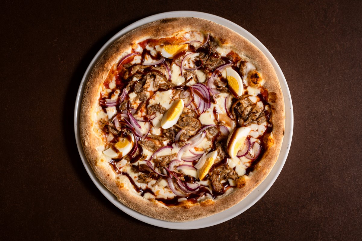 BBQ Pulled Pork, Onions, Mozzarella, and Boiled Egg.