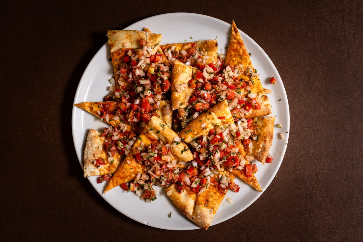 Tortilla chips covered in cheese, beans, mixed peppers, onions, pico de gallo, jalapeno, sour cream, salsa and guacamole