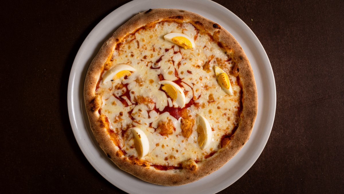 Tomato Sauce, Mozzarella, Mushrooms, Boiled Egg, Artichoke, Ham, Olives and Oregano.