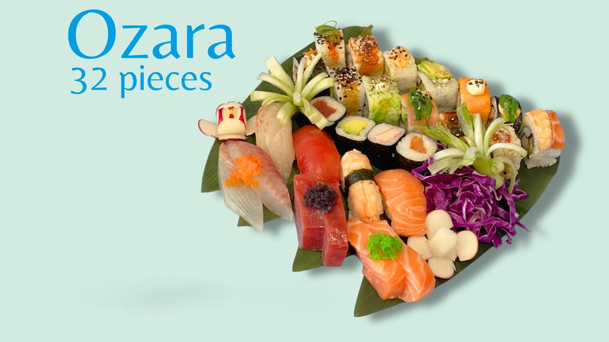 Including: 4 chicken teriyaki roll 4 sapidum roll 4 jazz roll 6 crab maki 6 avocado maki 4 salmon nigiri 4 prawn nigiri