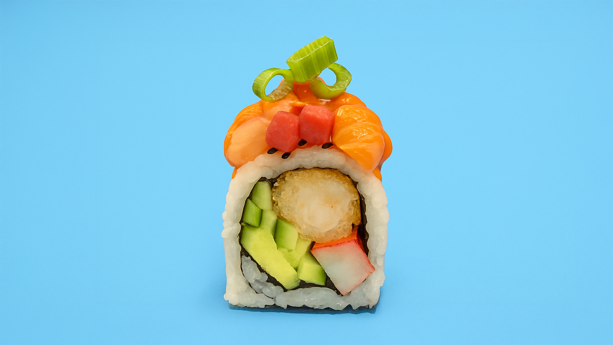 Crispy tempura, cucumber, avocado, spicy mayo, sriracha, topper with prawn tempura, spring onion, crab and mayo