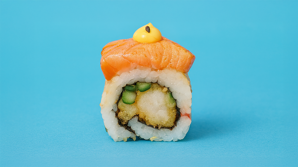 Prawn tempura, philadelphia and avocado topping with wasabi mayonnaise and onion flakes
