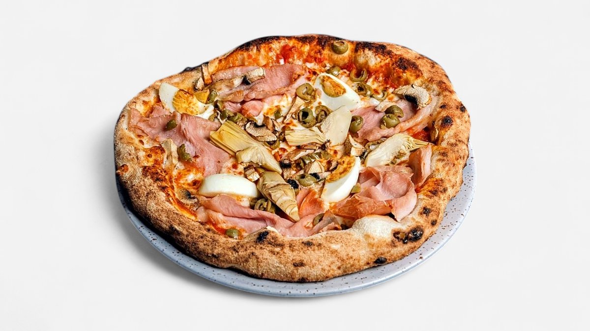Tomato sauce, mozzarella, ham, mushroom, boiled egg, olives and artichokes