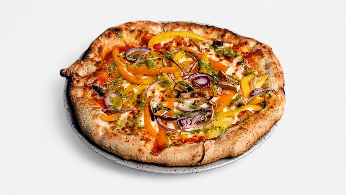 Tomato sauce, mozzarella, roast vegetables, caramelized onions and truffle oil