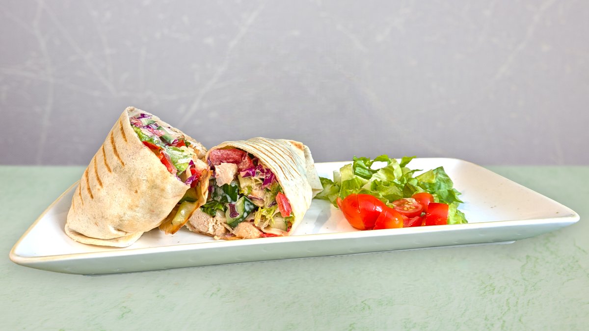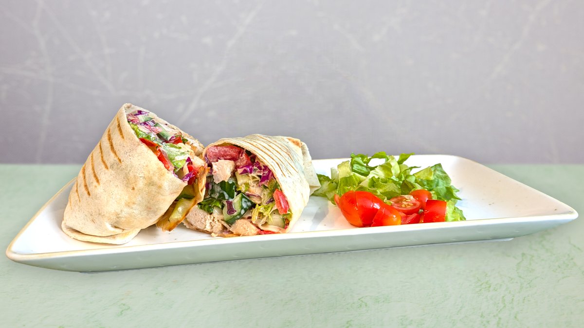 Chicken, mixed leaves (lettuce, rucola, parsley), tomatoes, onion, cucumber, peppers, cabbage, olive oil, mayonnaise, and soy dressing (crisps are not included) Calories: 582.8