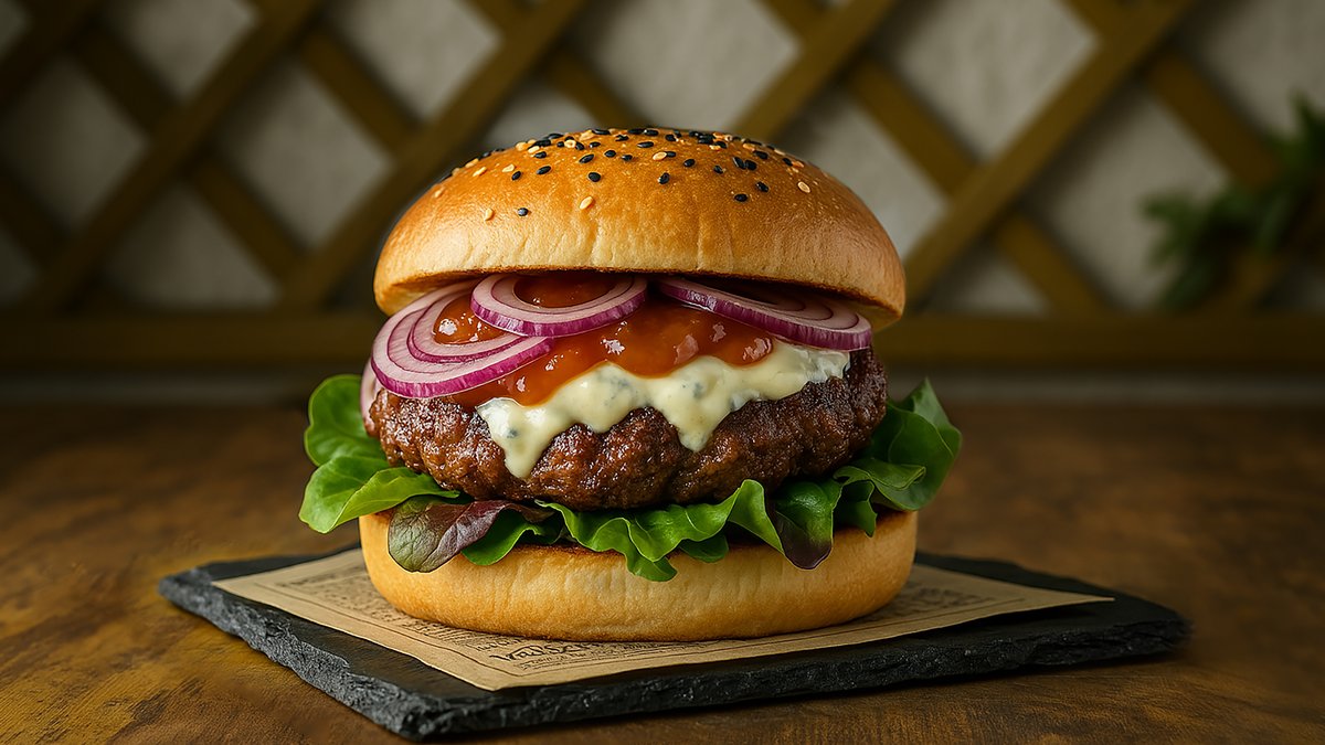 Brioche bun, beef patty, in-house blue cheese sauce, raw onion, mango chutney and mixed salad leaves
