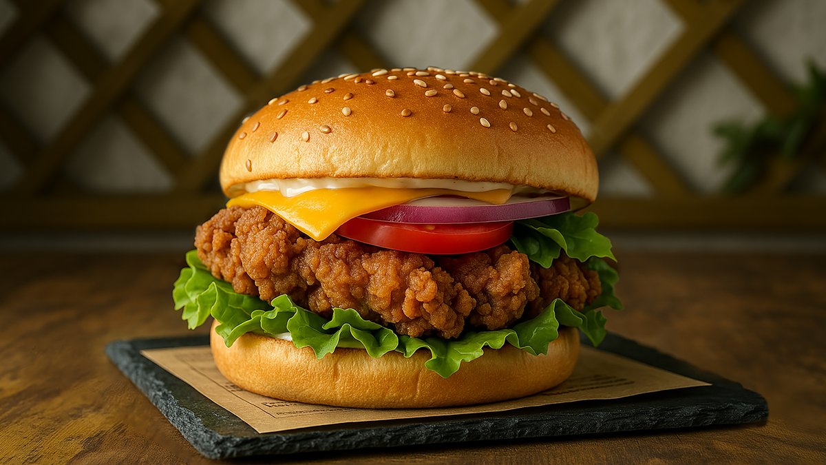 Brioche bun, buttermilk fried chicken patty, cheddar cheese, raw onion, tomato, lettuce and garlic mayo