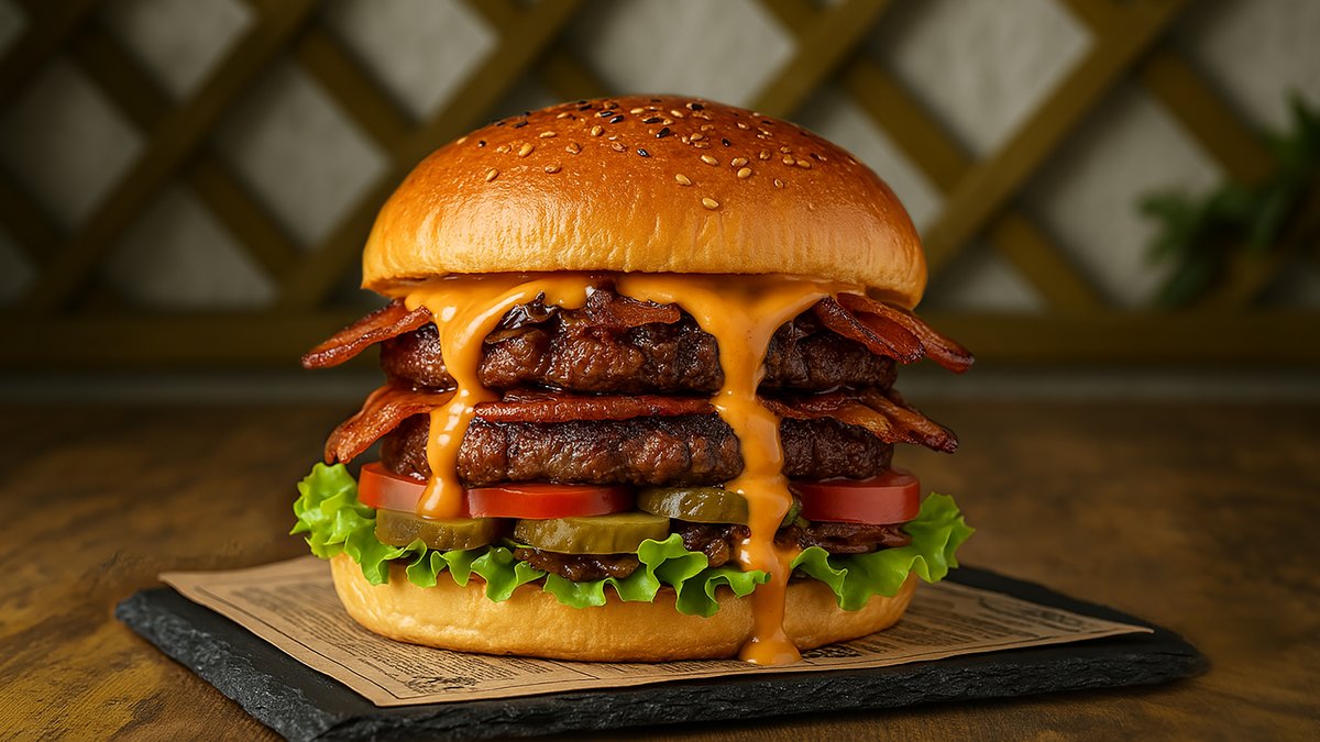 Brioche nun, two beef patties, bacon, caramelized onions, cheddar, gherkins, fried egg, double sausage, 4 onion rings, tomato, lettuce and King’s Gate sauce