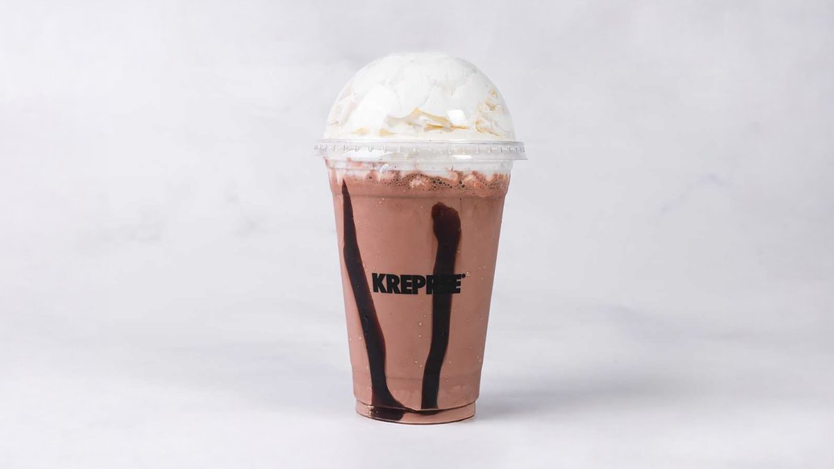 Krepree Kinder ice cream, chocolate syrup, milk and crushed biscuits
