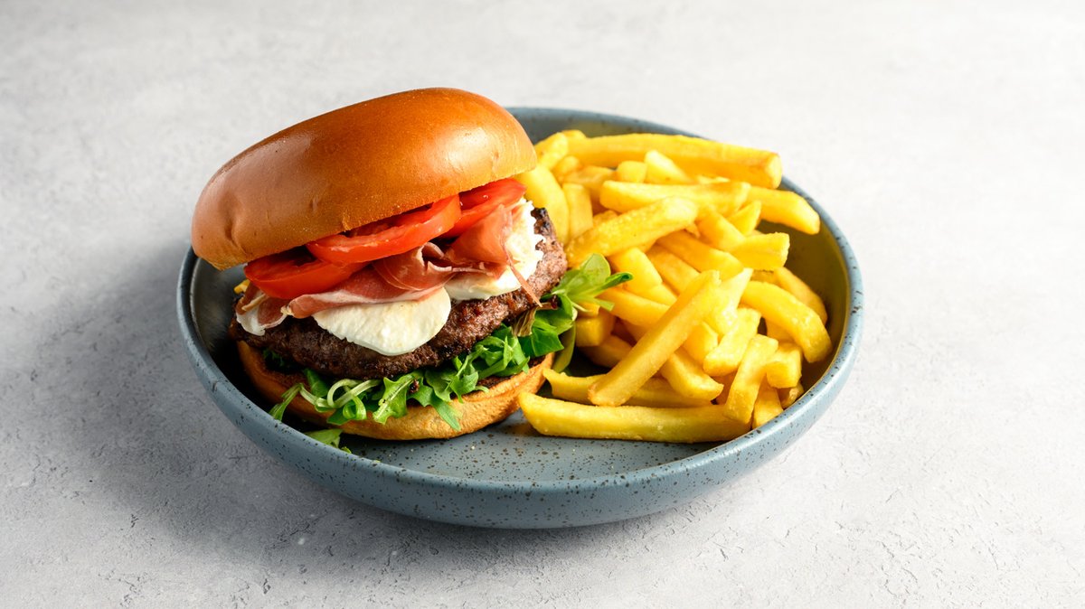 Homemade beef patty, mozzarella di bufola, parma ham, burger sauce, tomato and rucola