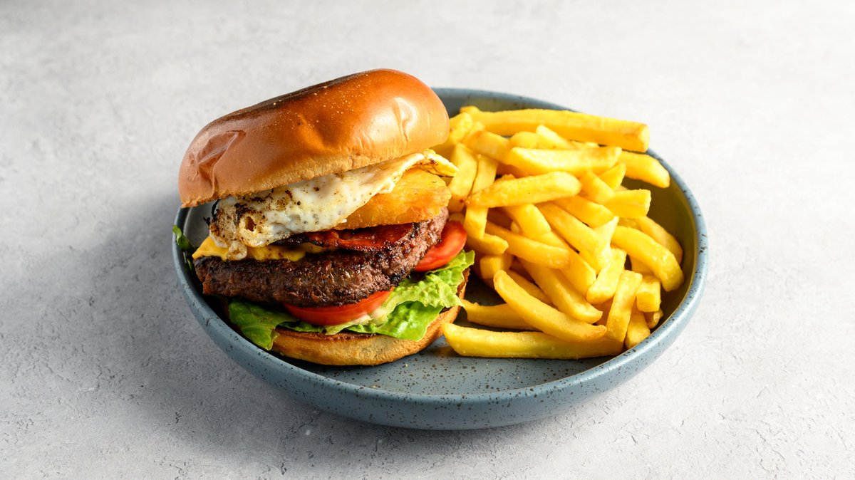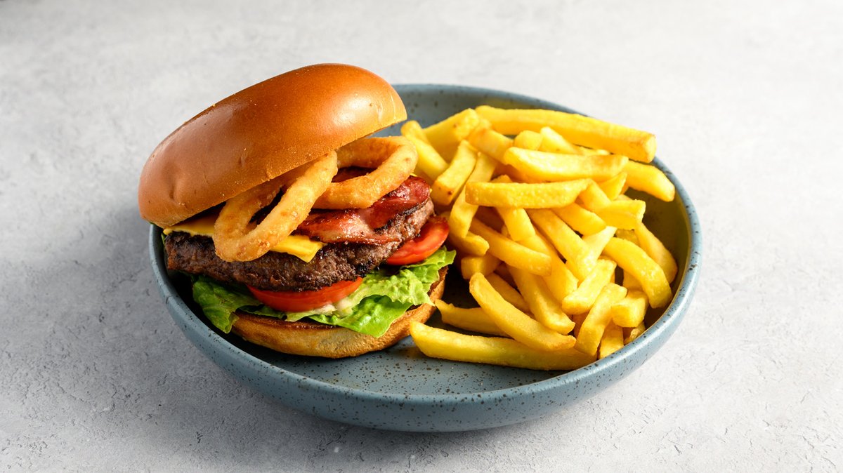 Homemade beef patty, bacon, onion rings, cheese, burger sauce, lettuce and tomato