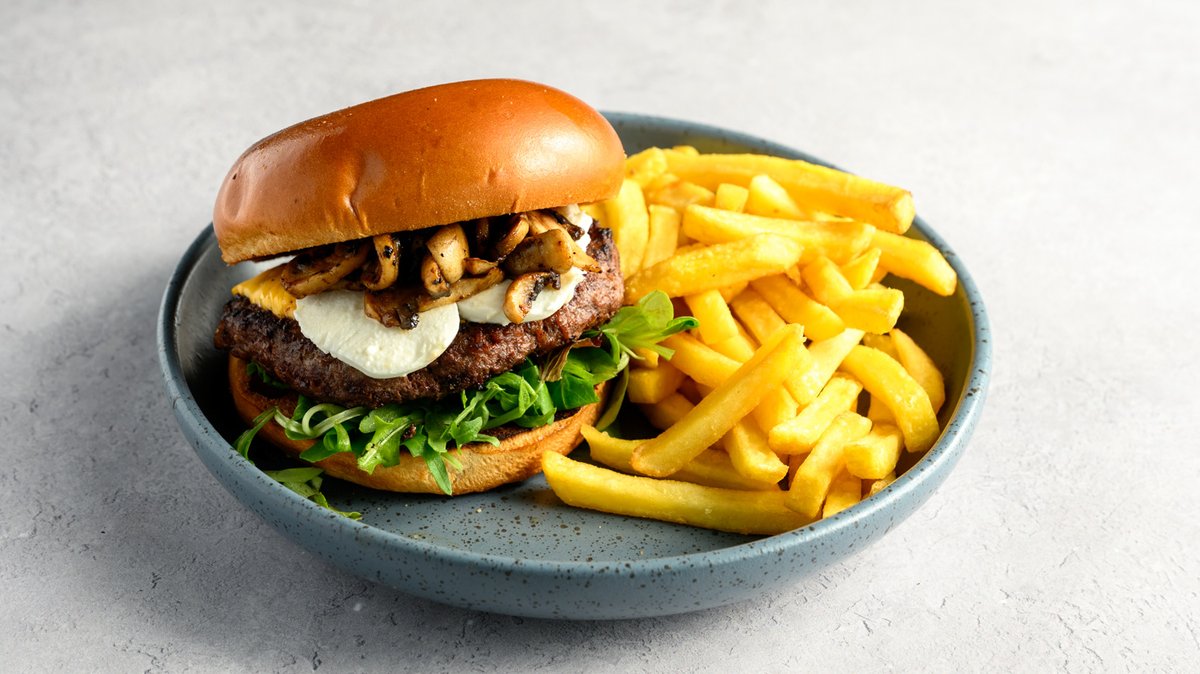 Homemade beef patty, mozzarella, mushrooms, burger sauce and rucola