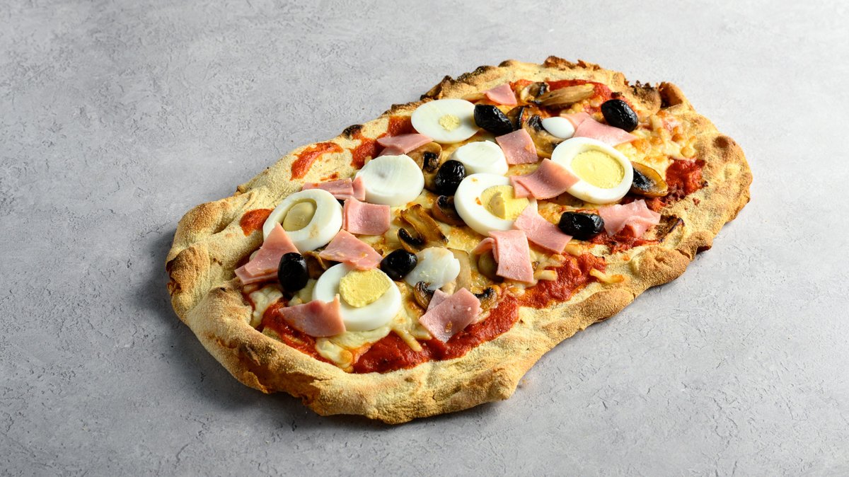 Tomato sauce, mozzarella, ham, mushrooms, olives and boiled egg