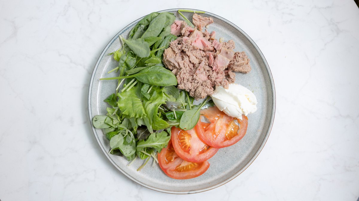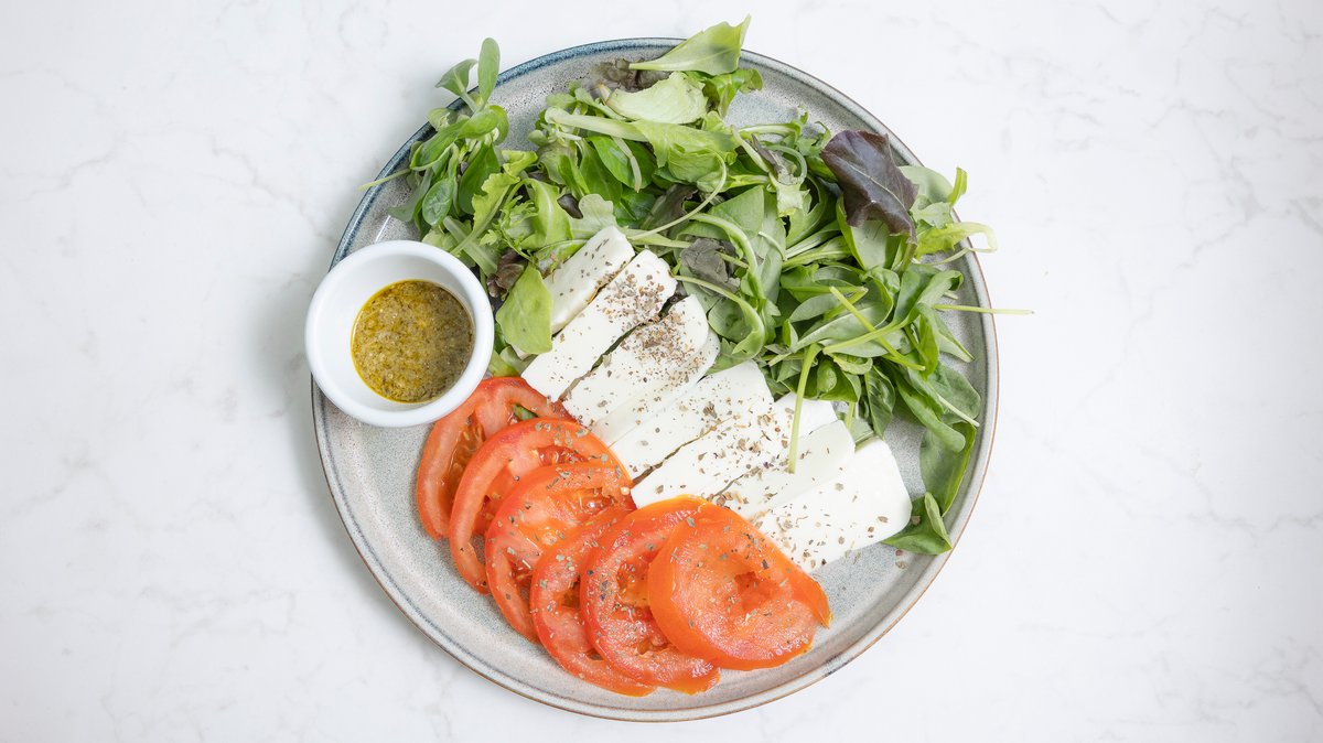 Misticanza and baby spinach, tomato, mozzarella and pesto
