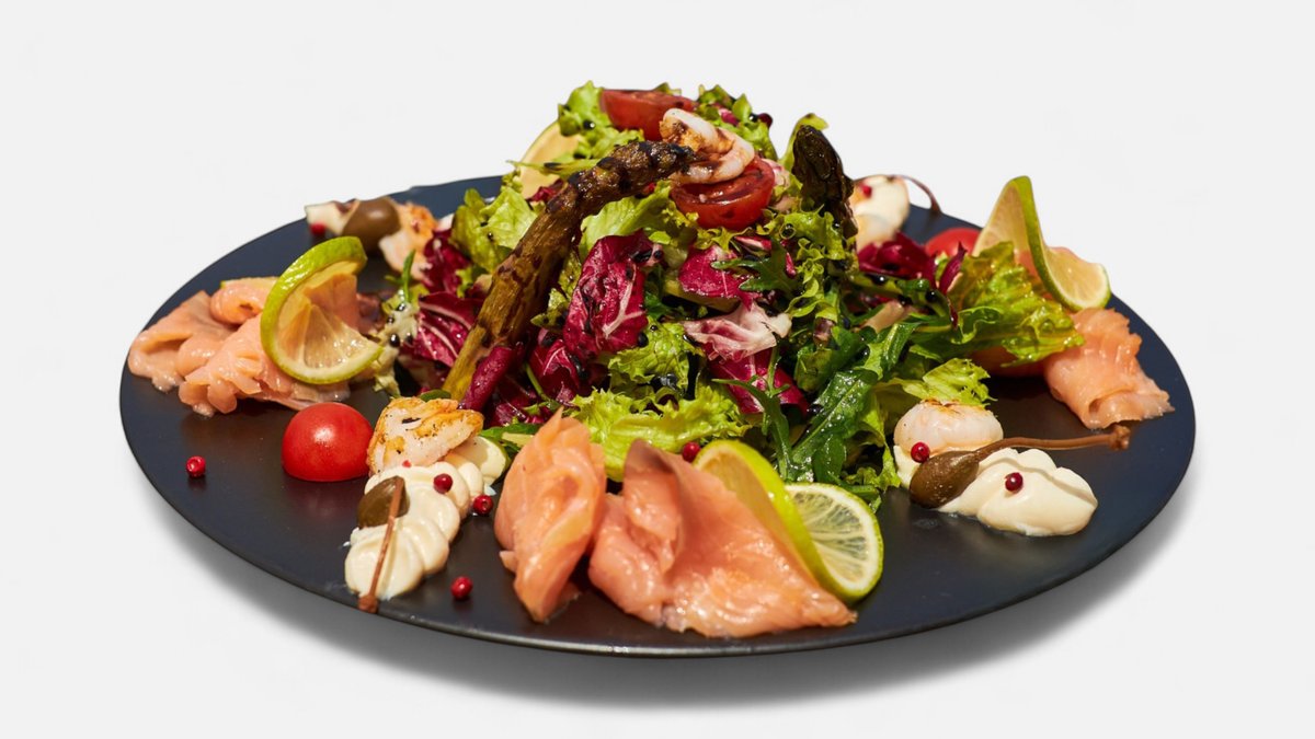 Mixed seasonal salad leaves, smoked salmon, cherry tomatoes, asparagus, caper berries, lemon cream cheese.