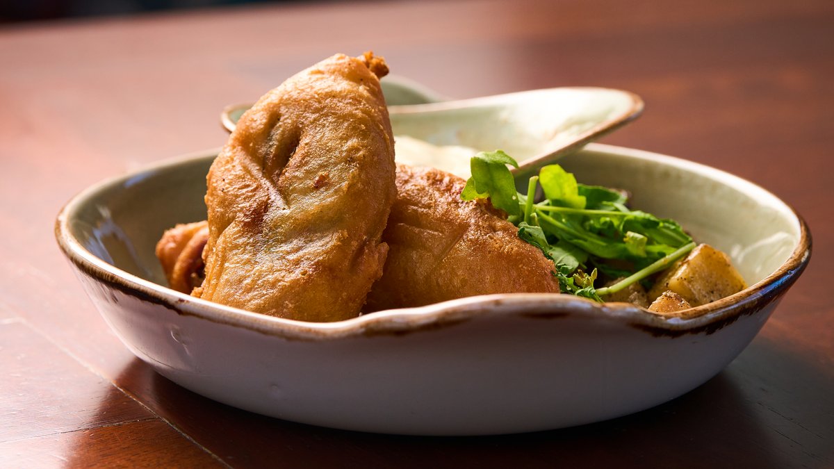 Thyme roast potatoes, tempura fried courgette flower filled with anchovies and mozzarella Fior di Latte served with chive and lemon mayo