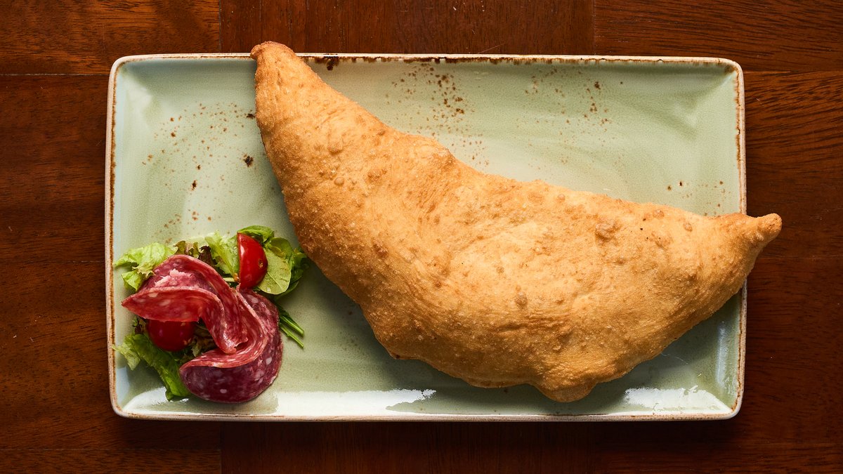 Closed pizza filled with mozzarella Fior di Latte, truffl cream, mushrooms, served with Parma ham, Parmesan cheese shavings, rocked salad leaves.