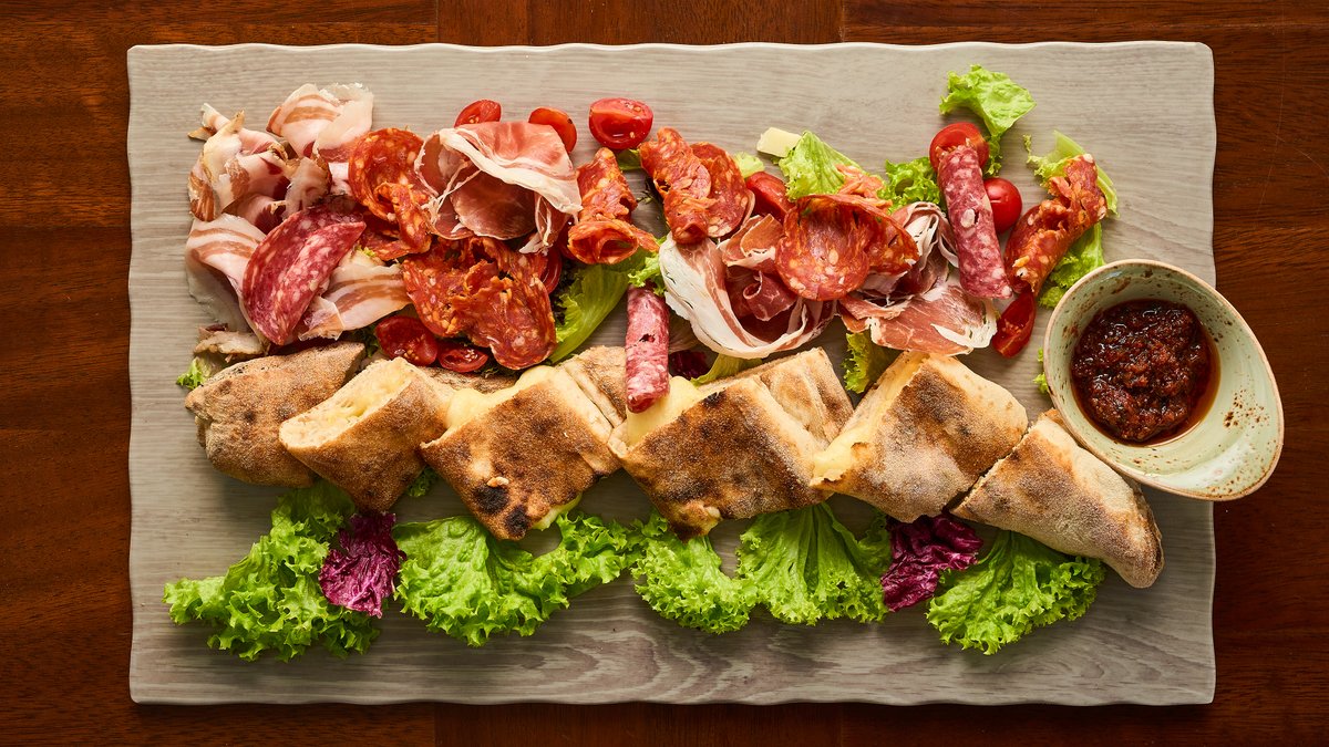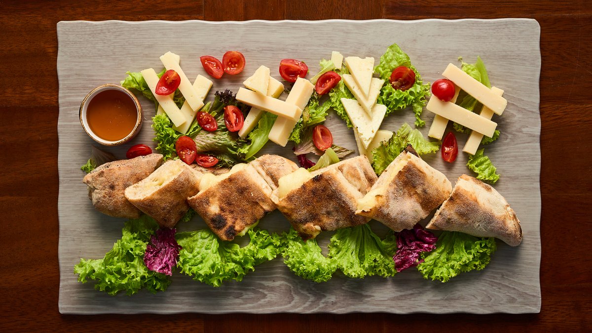 Mozzarella Fior di Latte, mushrooms, truffle cream, rocket leaves,cherry tomatoes, and parmesan shavings Complimented with Parma ham, mortadella, provolone, Parmesan and Pecorino cheese, finished with honey