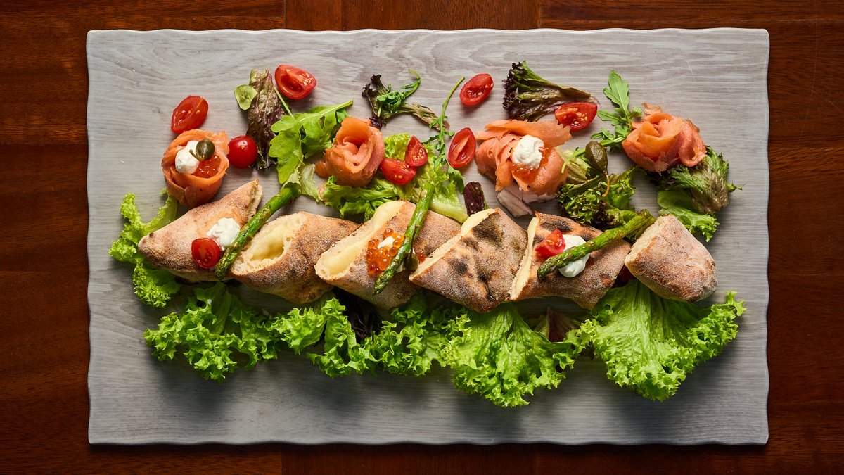 Mozzarella Fior di Latte, asparagus, onions, rocket leaves Complimented with cured salmon, keta caviar, capers and cream cheese