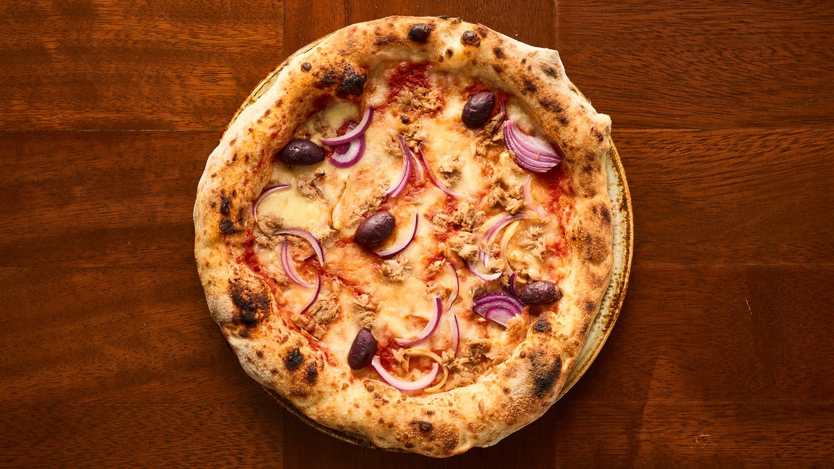 Tomato sauce,mozzarella fior di latte, tuna in oil, onions, Kalamata olives, extra virgin olive oil