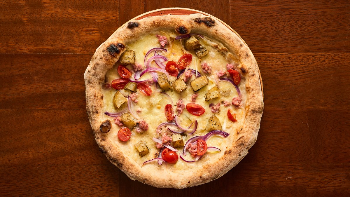 Mozzarella Fior di Latte, roast potato, onions, cherry tomato, and Italian sausage